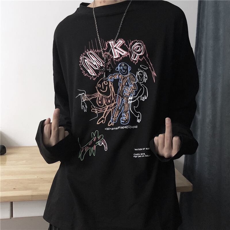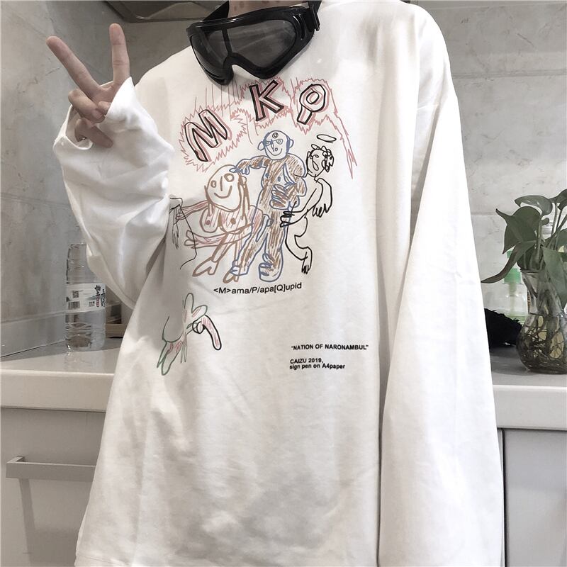 春のins原宿スタイルの楽しい漫画の手紙プリントシャツBFゆったりカジュアル長袖Tシャツの男性と女性の潮 Brother_is_Style2915948