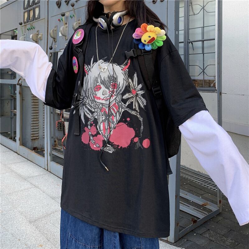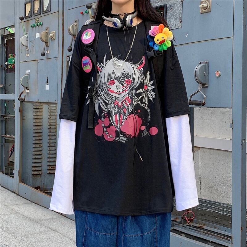 2020年秋の新作ins暗い葬儀アニメプリント長袖Tシャツ緩いフェイクツーピーストップス女性 Brother_is_Style80876590622