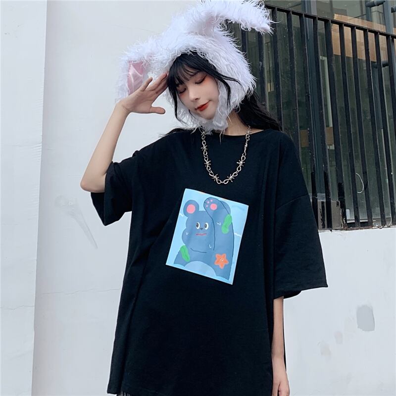 2020年夏の新バージョンのins風の漫画のクマのプリント半袖トップス緩い黒の半袖Tシャツ女性の潮 Brother_is_Style4124765