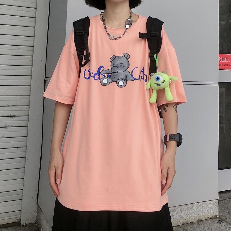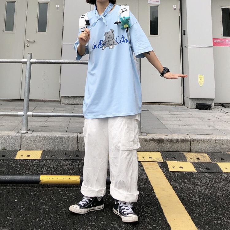 ライトブルートップ夏2020新しいバージョンins漫画クマプリント学生緩い半袖Tシャツ女性のトレンド Brother_is_Style2501440