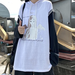 2020年秋の新女性版ins漫画プリントフード付きトップスルーズホワイトステッチ長袖Tシャツトレンド Brother_is_Style7154386