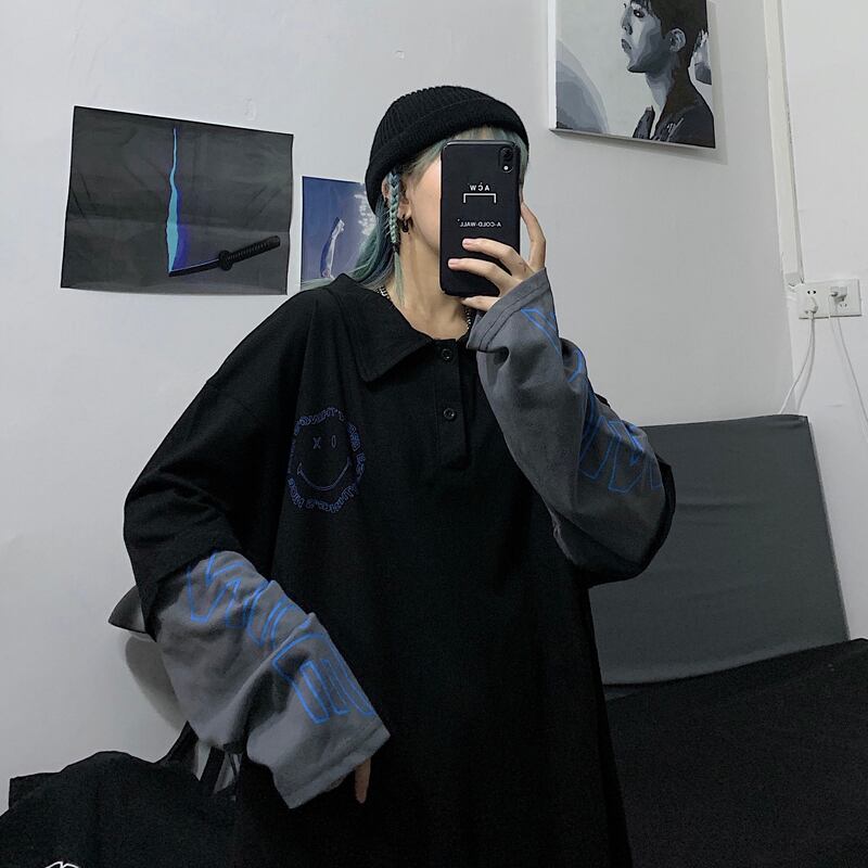 2020年秋新作insレトロレタープリントポロフェイクツーピーストップスゆったり長袖Tシャツレディーストレンド Brother_is_Style88398638033