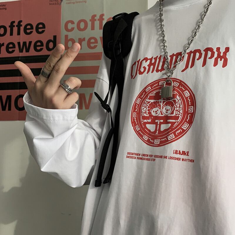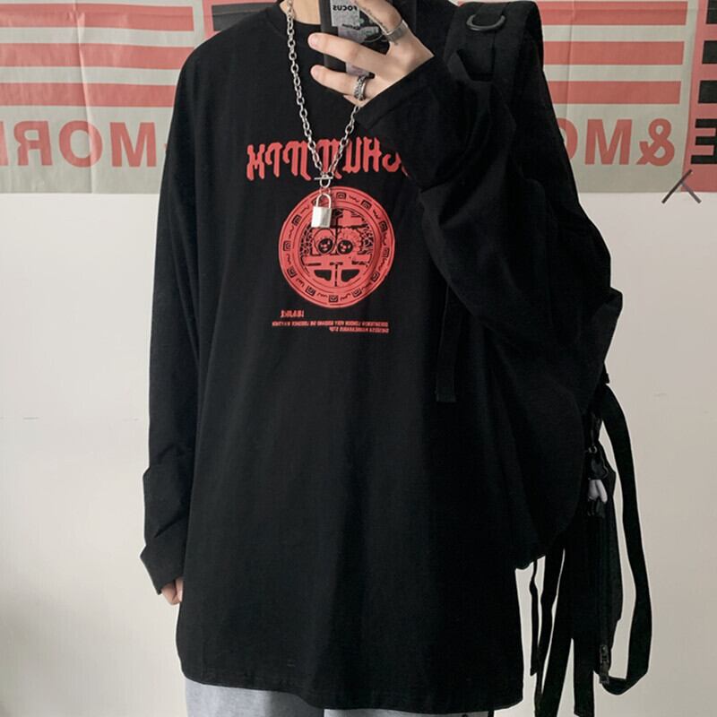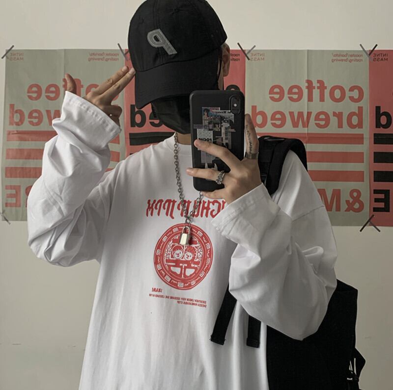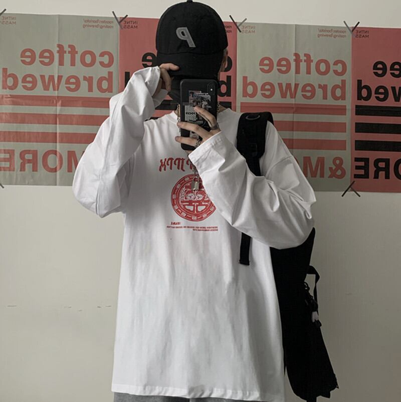 2020年秋新作原宿スタイルのコントラストプリントトップスゆったり黒長袖Tシャツ男女 Brother_is_Style12961711731