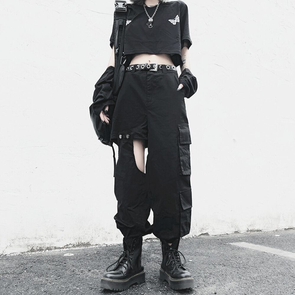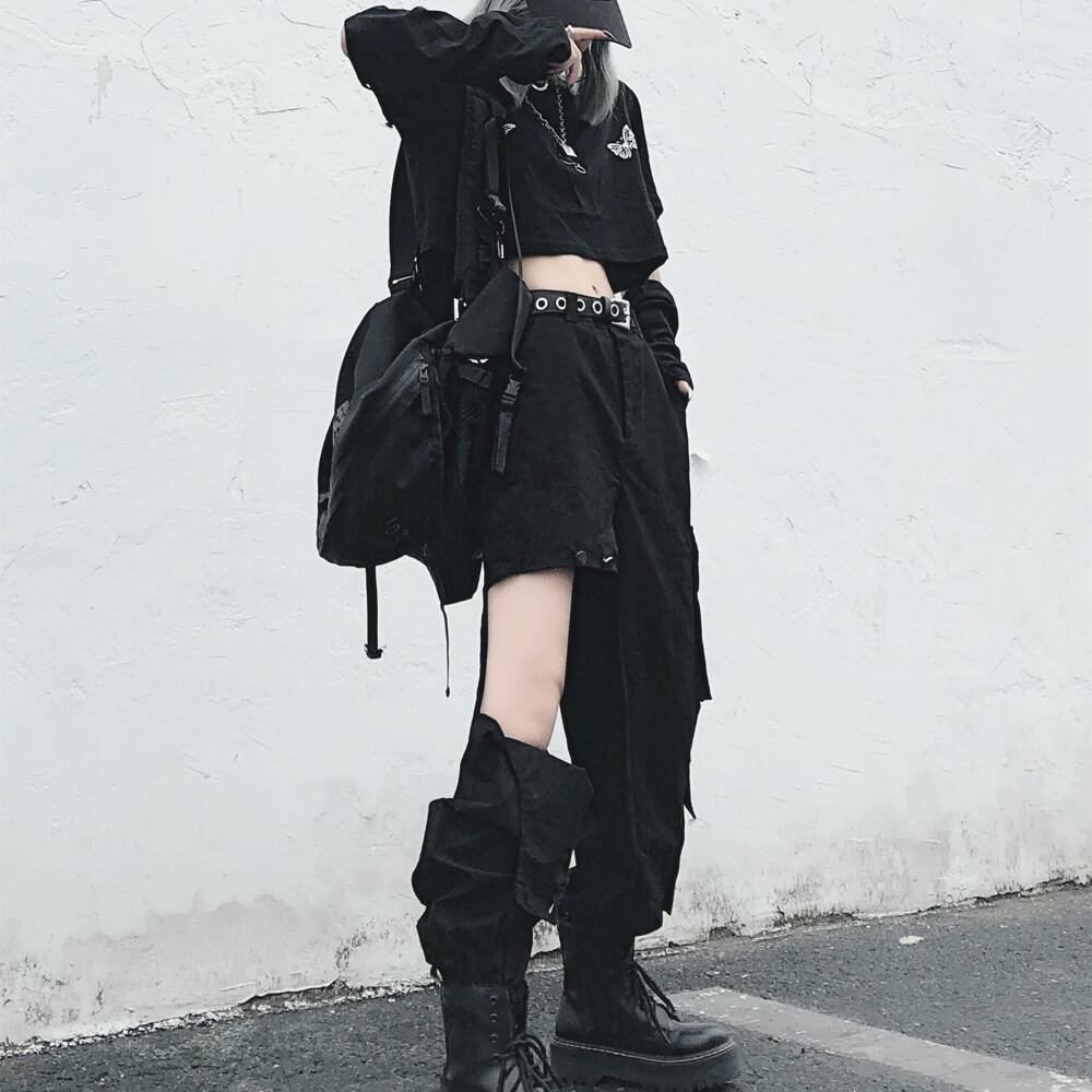 ショートネーブルクロップトップメスバージョンインスブラックロングスリーブTシャツ+薄いオーバーオールとツーピースカジュアルパンツ Brother_is_Style25888112219