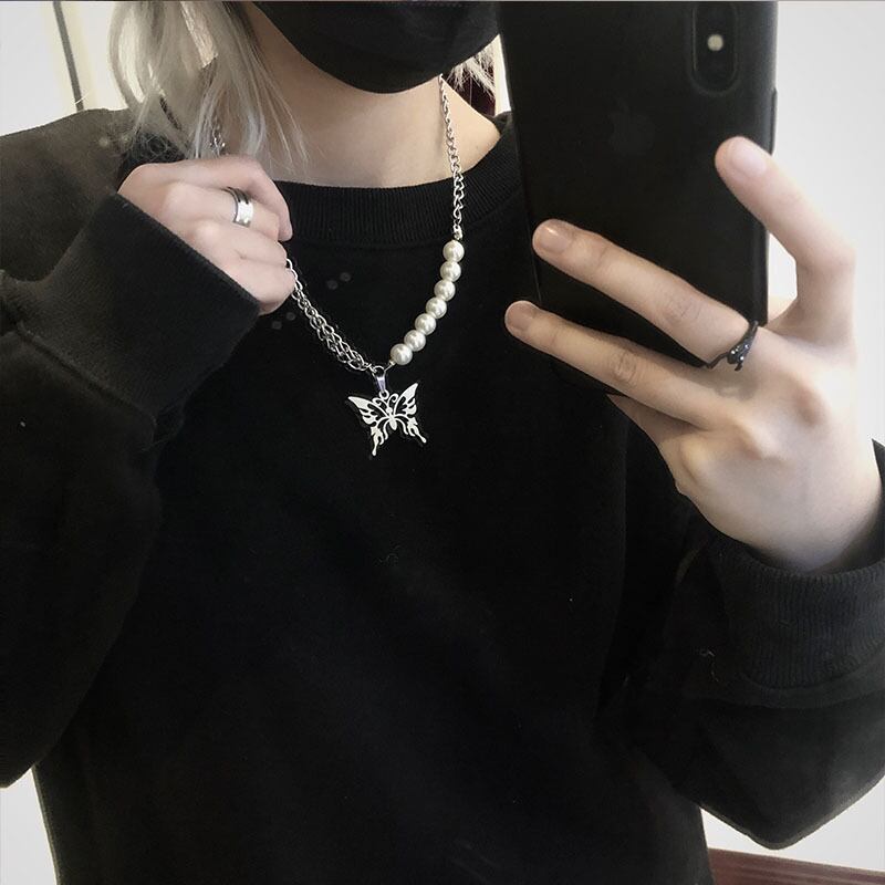 南insネット赤レトロバタフライペンダントアクセサリーヒップホップパールチタン鋼多層カップルネックレスジュエリー女性の潮 Brother_is_Style2419189
