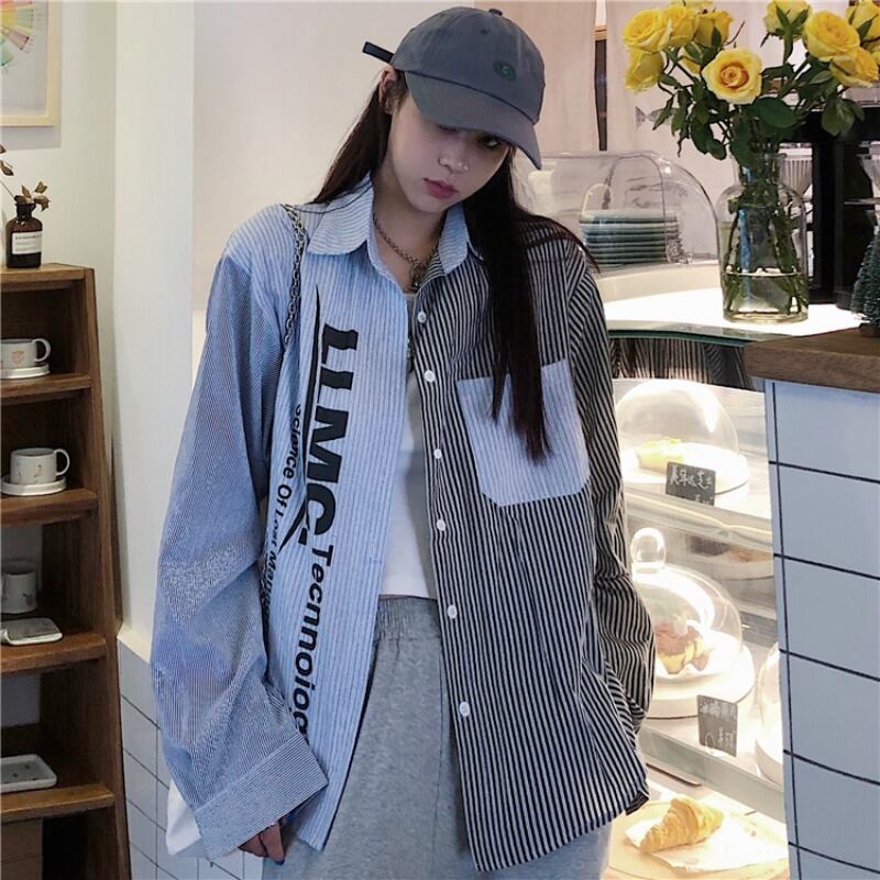 シャツ女性の秋バージョンinsレトロなヒットカラーのストライプ長袖シャツ緩い野生のプリントシャツジャケット潮 Brother_is_Style5466580