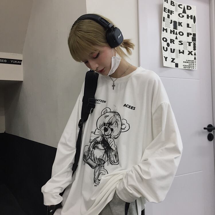 2020女性の新しい初秋バージョンinsレトロなクマネット赤トップルーズホワイト長袖Tシャツカップル潮 Brother_is_Style3639185