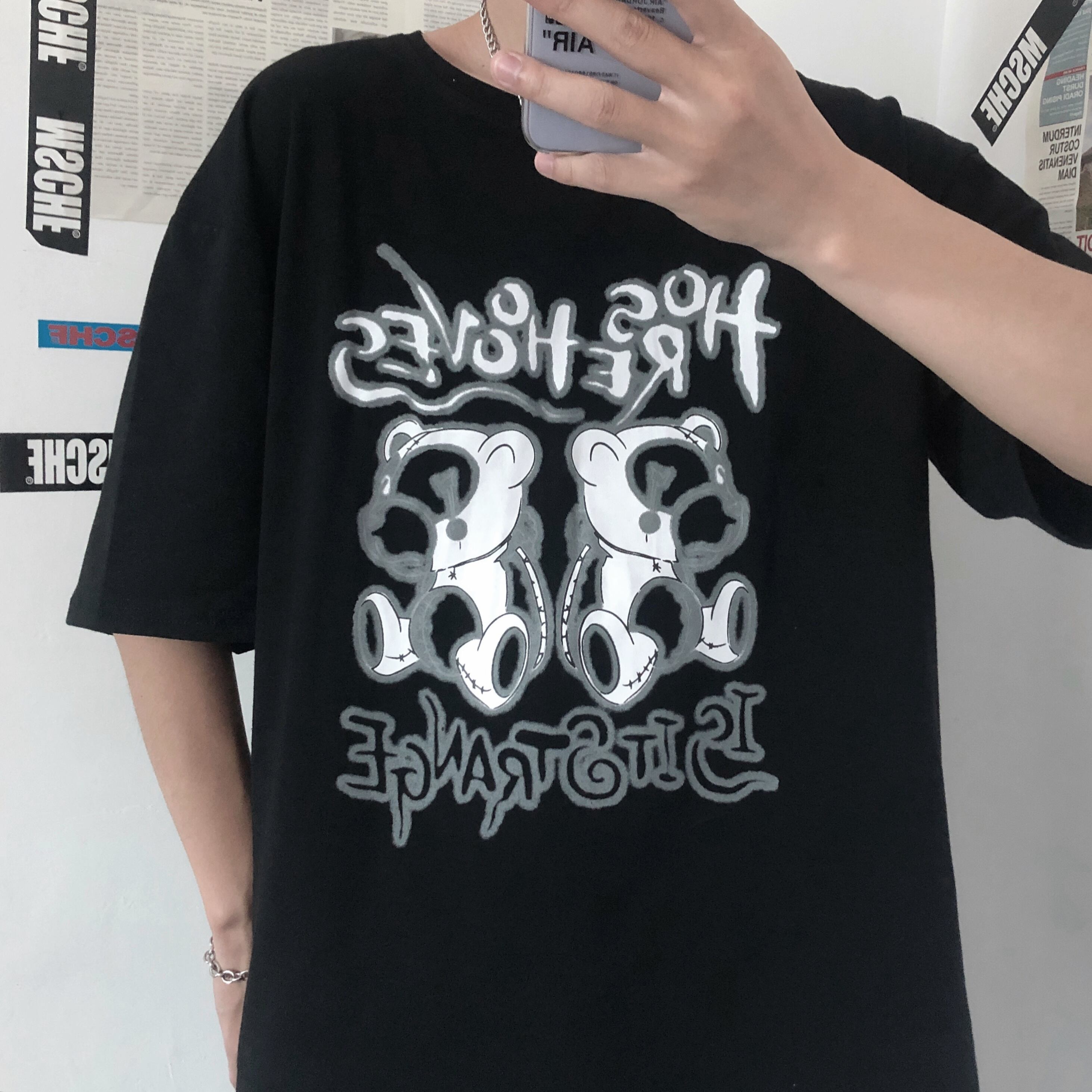 2020年夏バージョンのinsストリートグラフィティベアプリントホワイトシャツルーズ半袖Tシャツの男性と女性 Brother_is_Style0237681