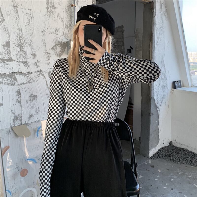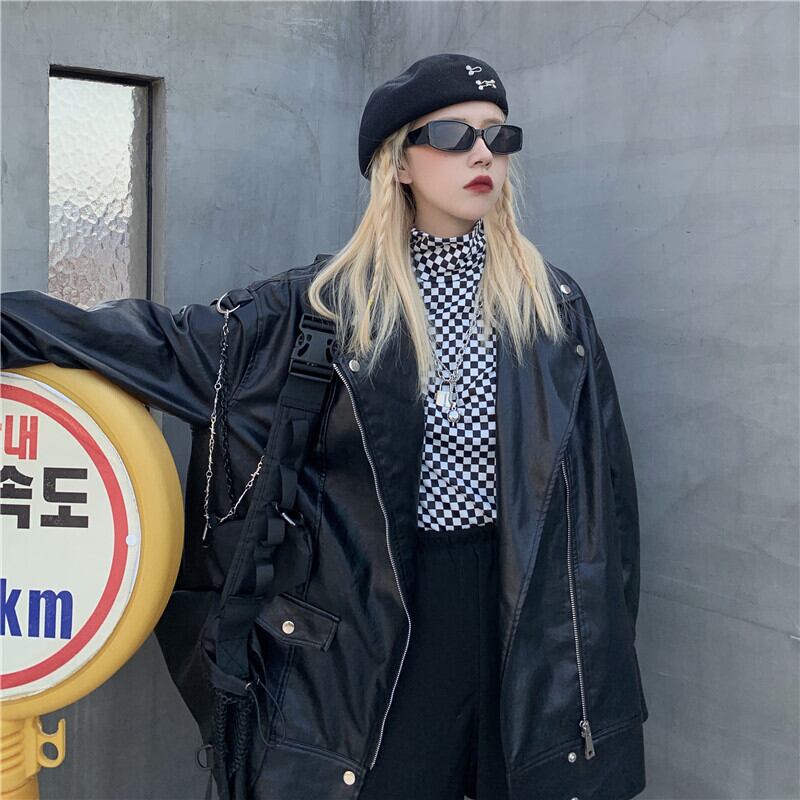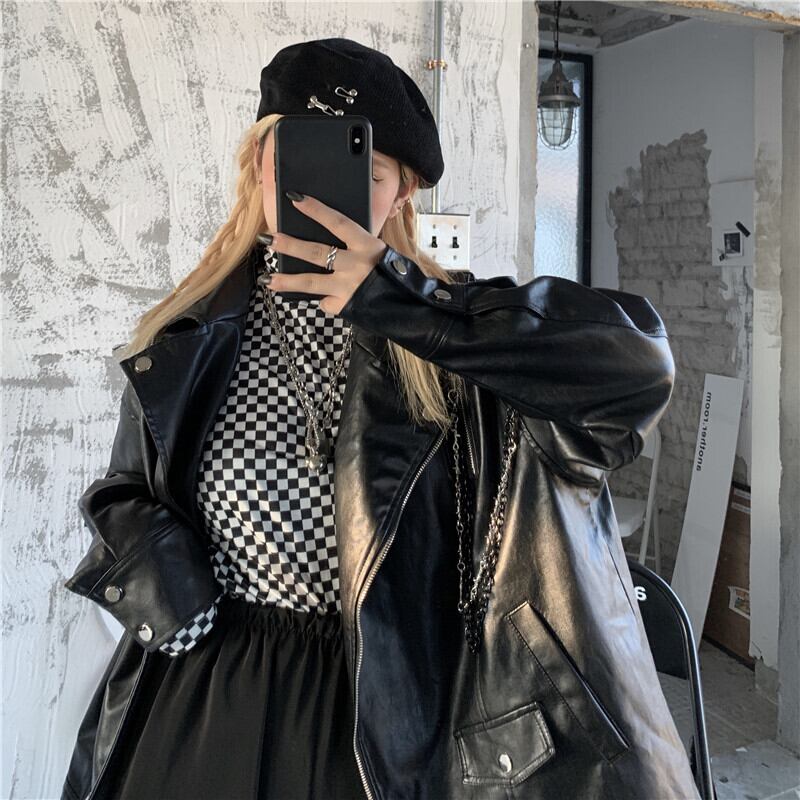 2020年秋冬新バージョンインハイカラーチェック柄ボトミングシャツブラックルーズレザージャケットジャケット女性トレンド Brother_is_Style70852113505
