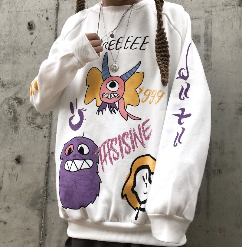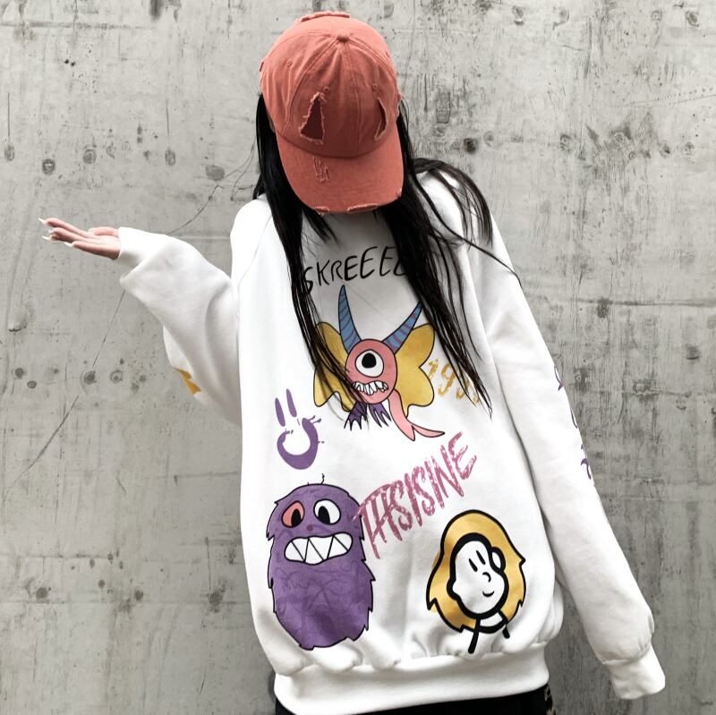 2020年の新しい秋のバージョンのins楽しい漫画長袖トップルーズホワイトプラスベルベットフードレスセーター女性潮 Brother_is_Style58769701698