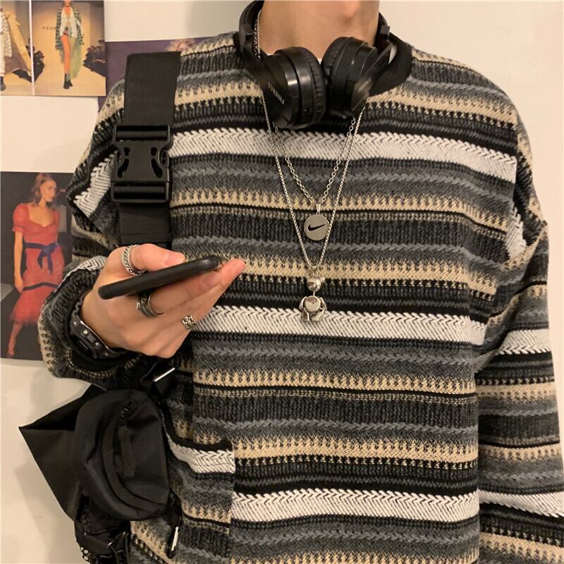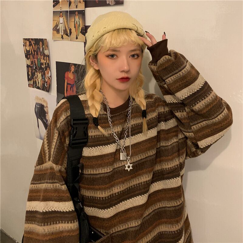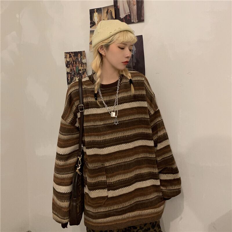 セーター2020新しい女性の秋のバージョンins原宿スタイルレトロストライプルーズアウターウェアラウンドネックセータートレンド Brother_is_Style63398006483