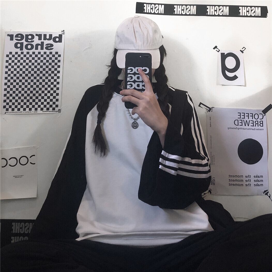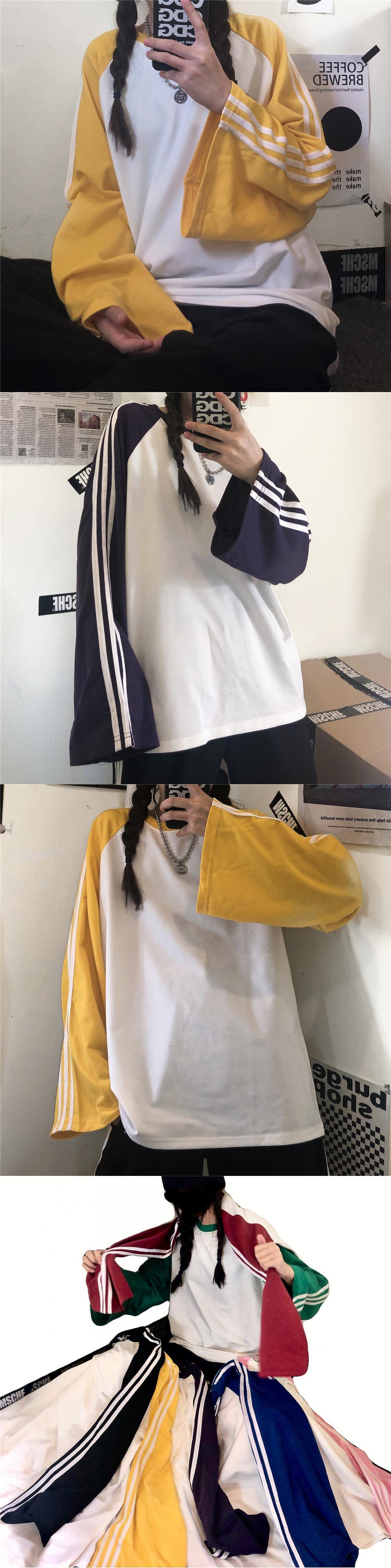 レディース秋バージョンinsシンプルbfスタイルレトロストライプカラーマッチング長袖シャツルーズスチューデントラウンドネックTシャツタイド Brother_is_Style25578261317