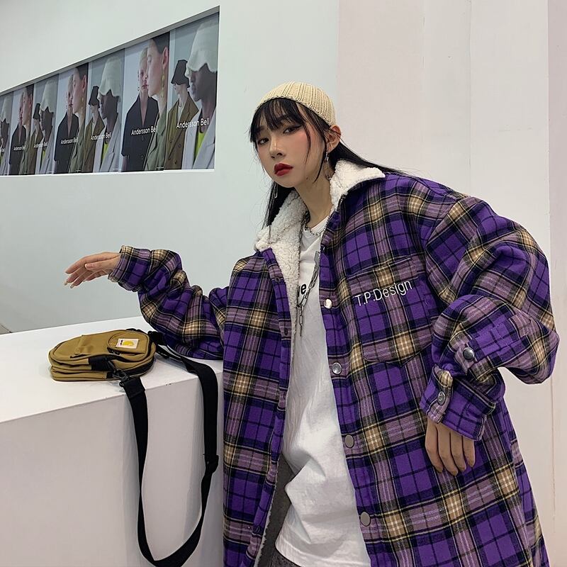 ラムウールコート女性の冬バージョンのins香港スタイルのルーズな両面ウェアとベルベットの厚いチェック柄のコットンコート Brother_is_Style17825791555