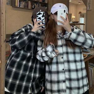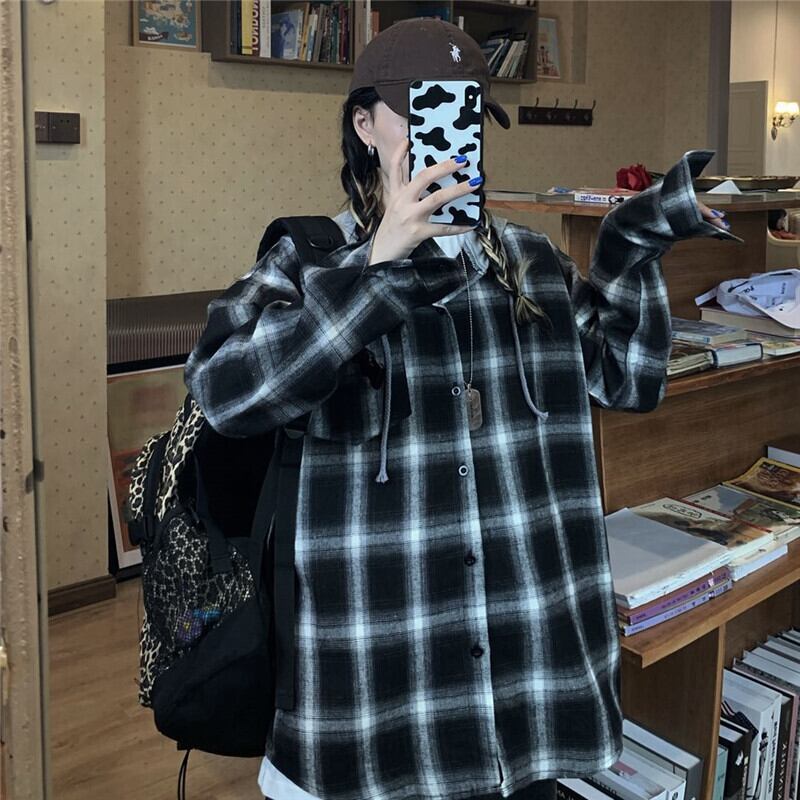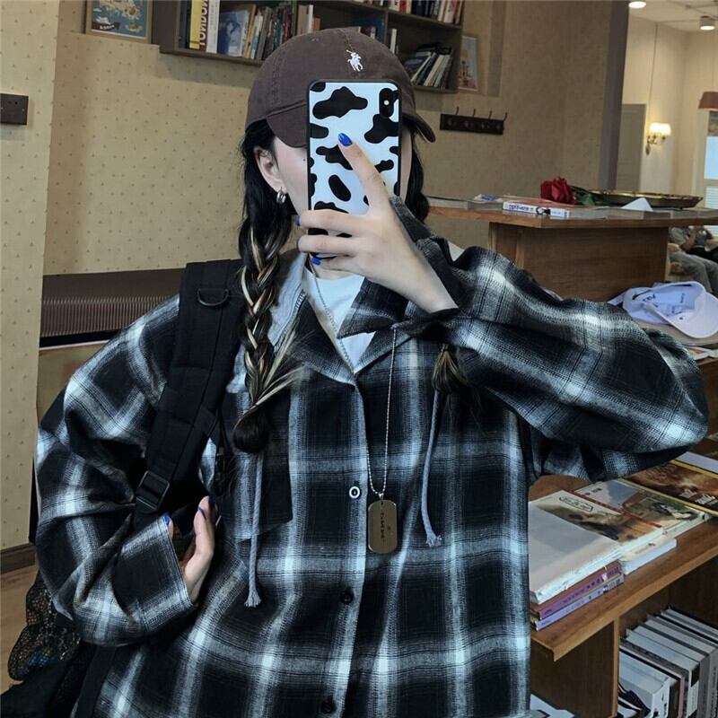 秋バージョン原宿ポートスタイルレトロチェック柄フード付きシャツルーズカップル長袖トップコート女性トレンド Brother_is_Style1340217784