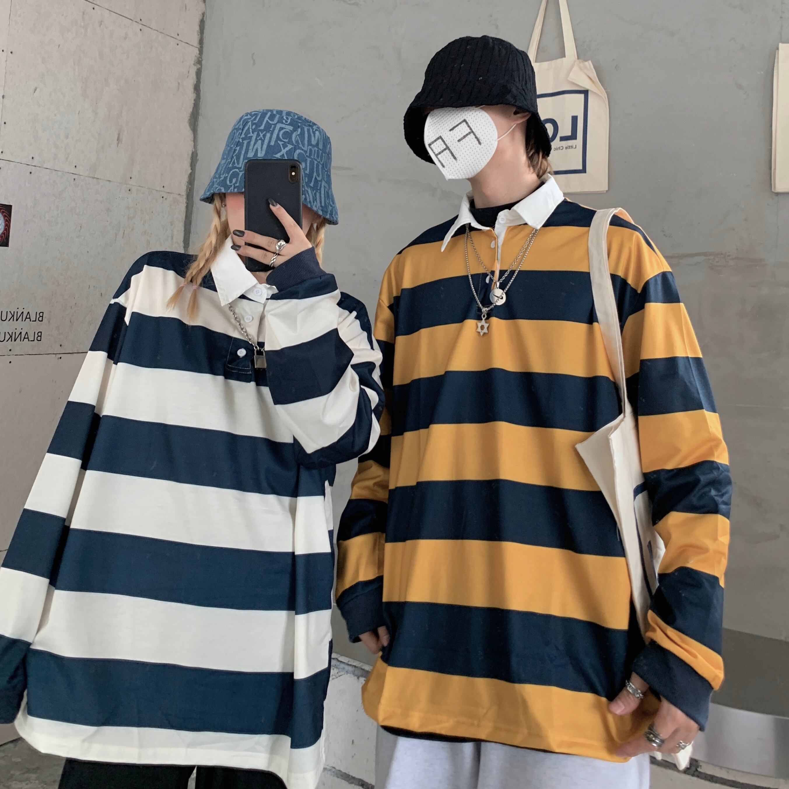 2020年秋新バージョンins香港スタイルストライプボトミングトップルーズカップル長袖Tシャツポロシャツ Brother_is_Style36350997015