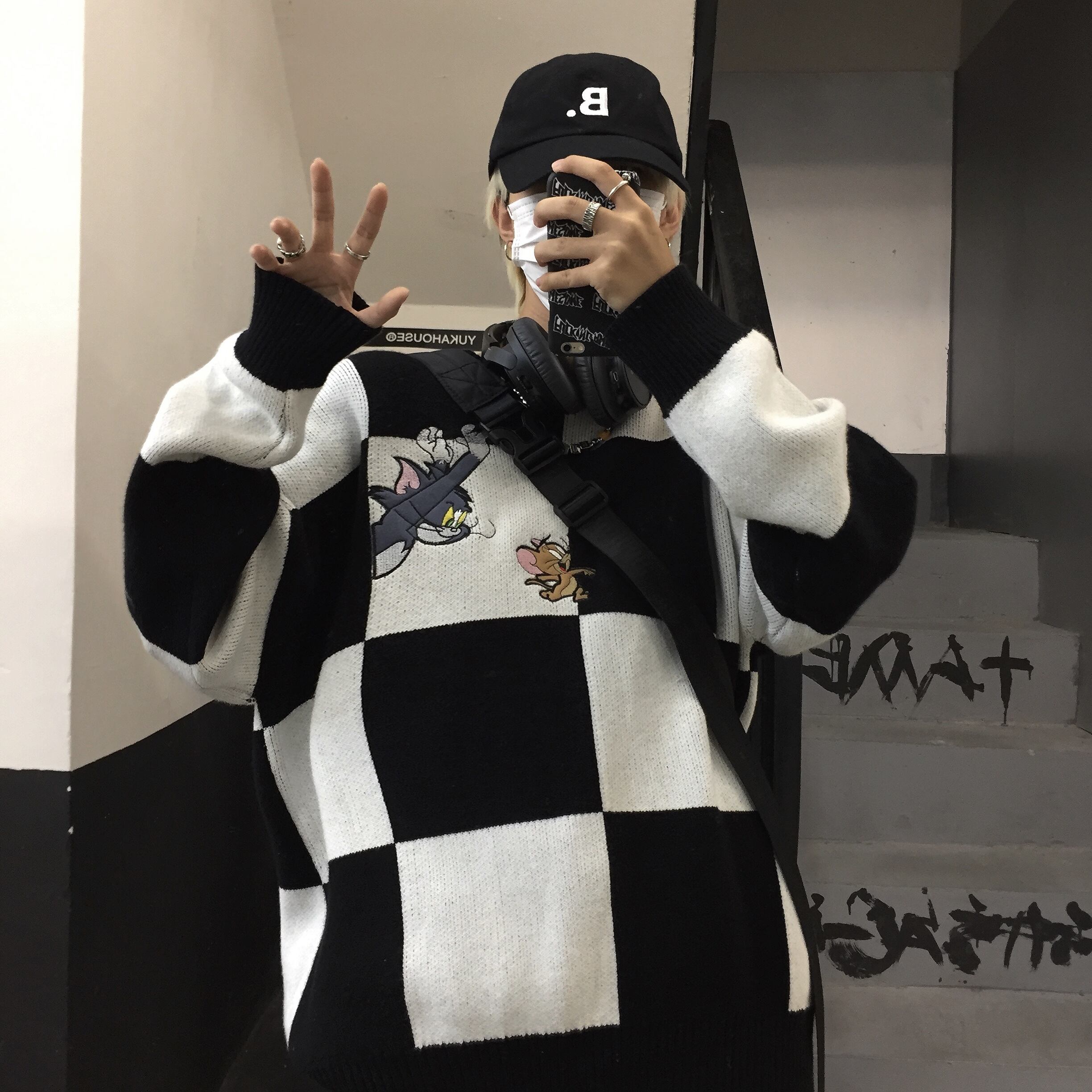 2020年秋冬新バージョンins漫画刺繡格子縞セータールーズアウターウェアプルオーバーセーター男性と女性 Brother_is_Style58998989897