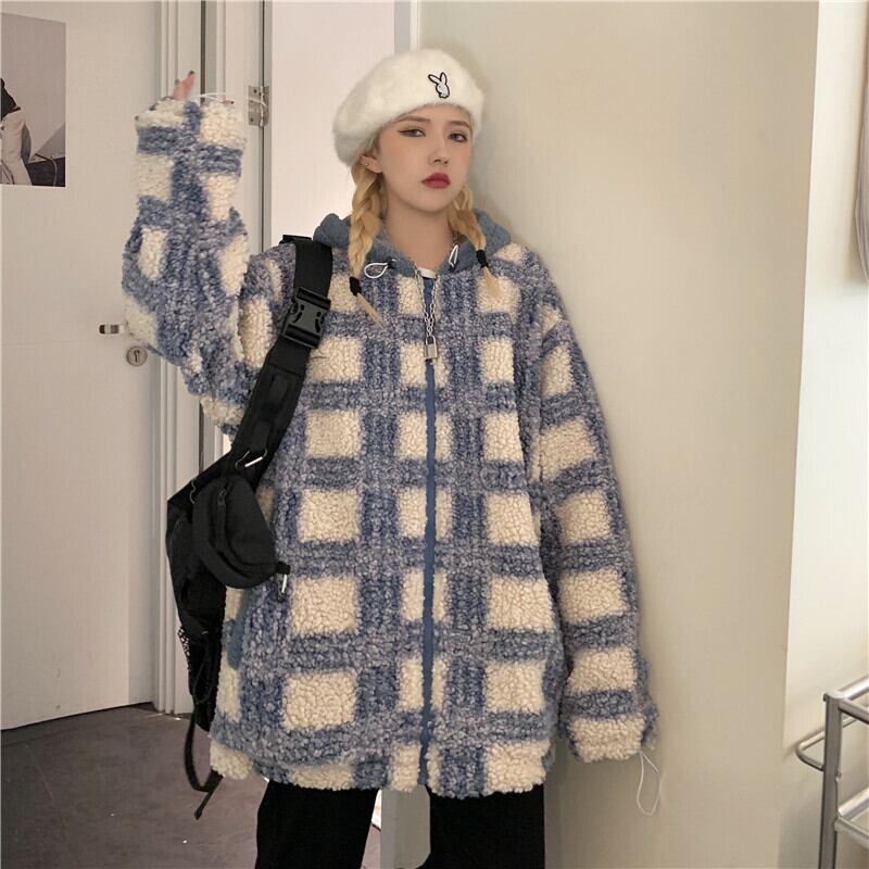 ラムウールコート女性2020年冬新バージョンインレトロチェック柄ルーズ厚フード付きコットンパッド入りジャケット Brother_is_Style40621709982