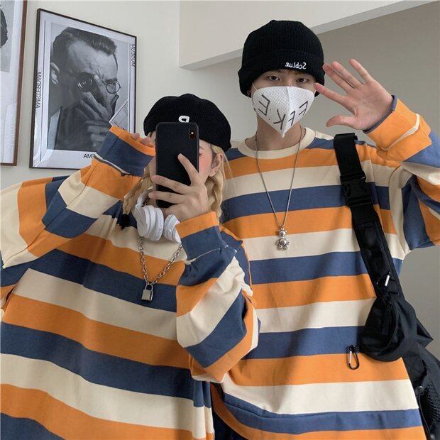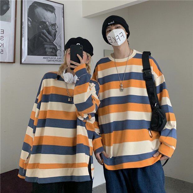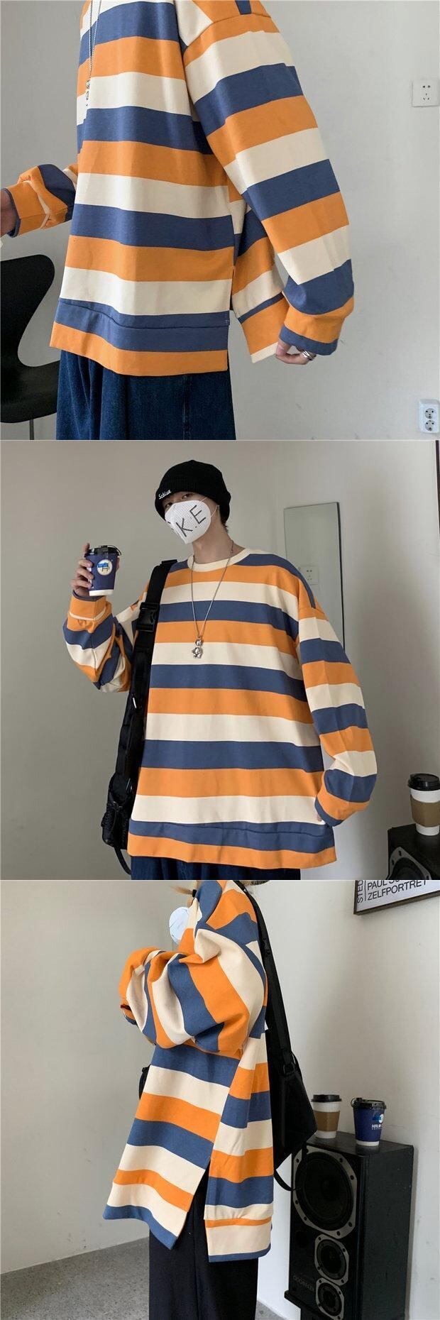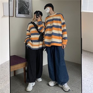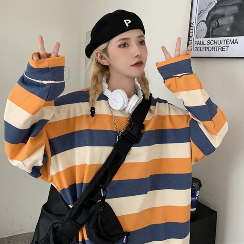 オータムスタイルストライプブラウス レディースルーズラウンドネックTシャツ ロング かわいい 秋物 Oネック Brother_is_Style93666346784