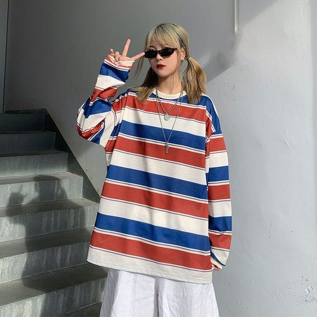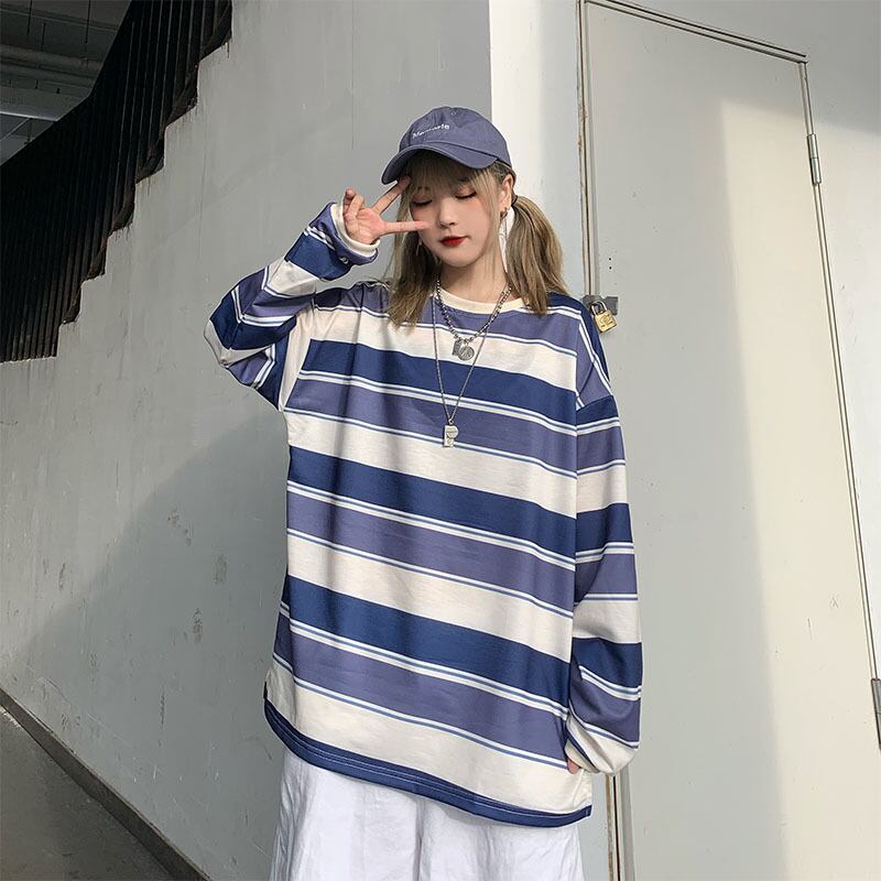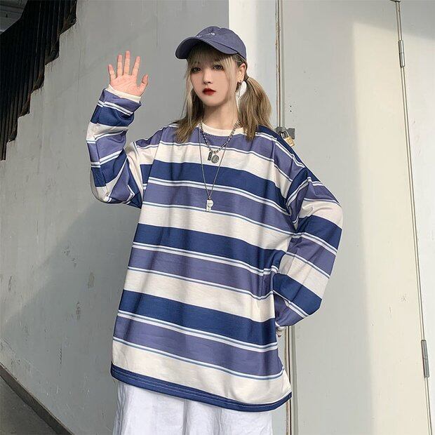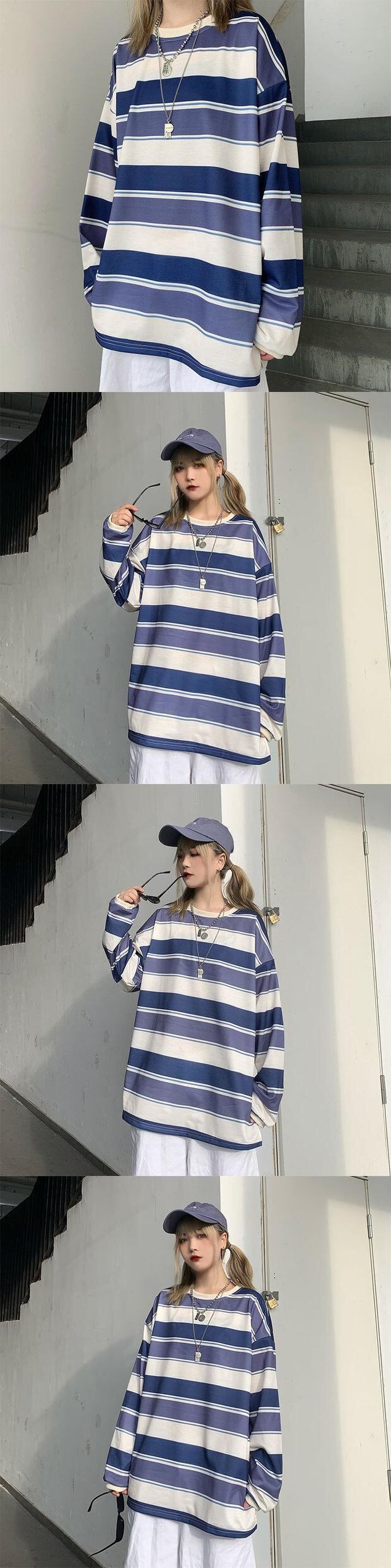 オータムスタイルスタンダードストライプシャツ ルーズラウンドネックTシャツ ロング レトロ かわいい 秋物 Oネック Brother_is_Style21712359058