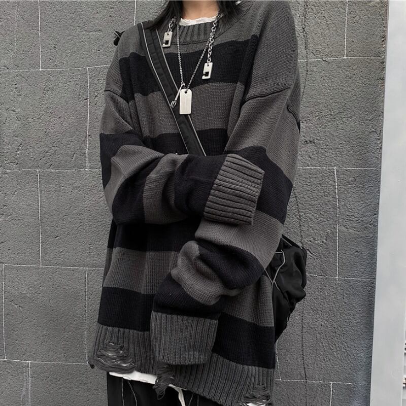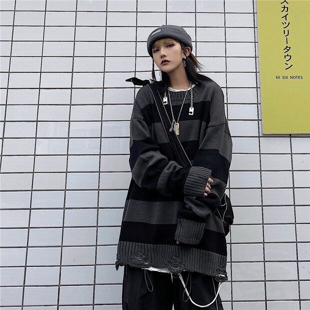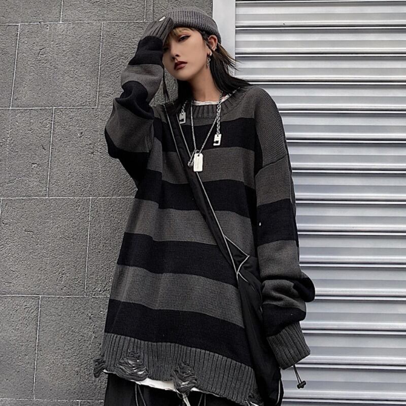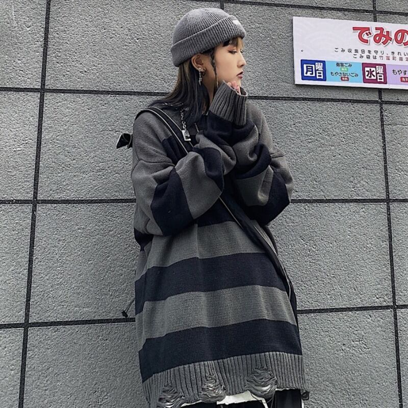 2020年の新しい秋冬バージョンのins怠惰な風の縞模様の破れたセータートップルーズアウターウェアセーター女性のトレンド Brother_is_Style6936663212