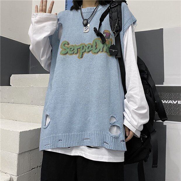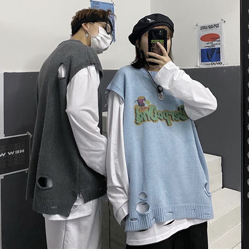 セーターベスト女性2020新しい秋と冬のバージョンインレトロホールニットセータールーズノースリーブアウターウェアベスト Brother_is_Style17685586734