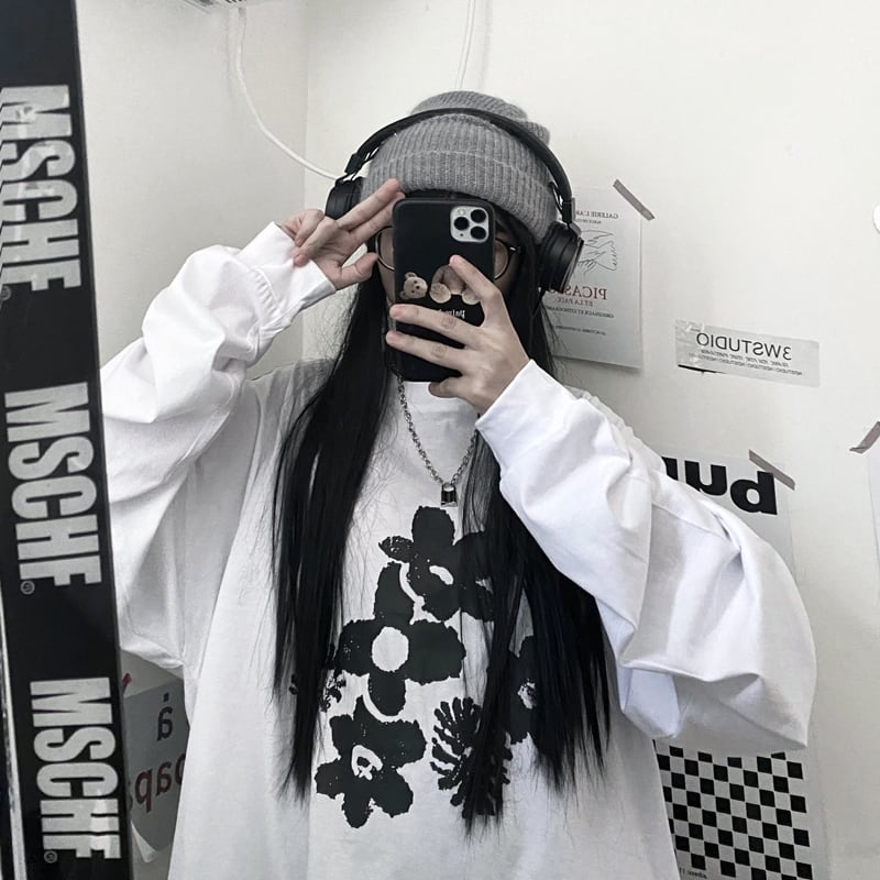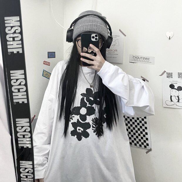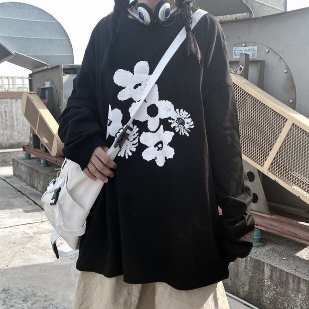 スプリングオータムダークFlowerデザイン プリントTシャツ シャツ ルーズ ロング 春物 秋物 フラワーデザイン Brother_is_Style20833444927
