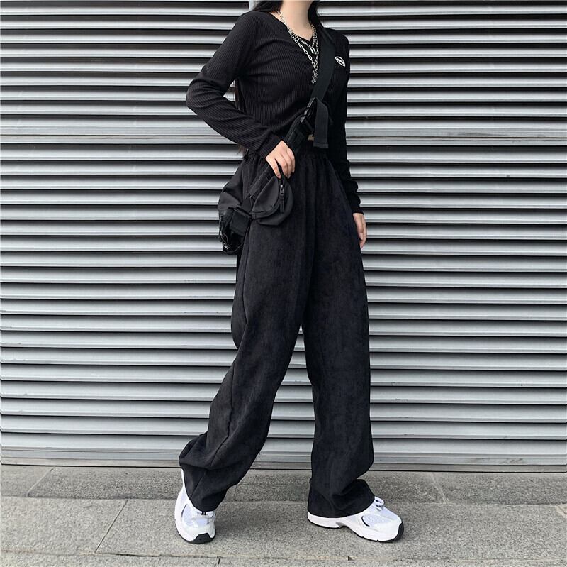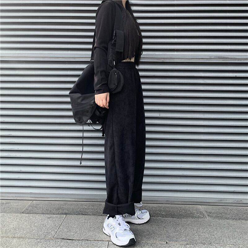 コーデュロイパンツ スプリングスタンダードブラックルーズハイウェストウェストワイドレッグカジュアル レトロ 春物 ワイドパンツ Brother_is_Style25596685411