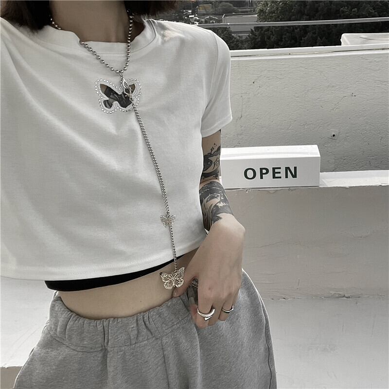 ショートトップス レディースサマーButterflyデザイン スリムブラックTシャツ 夏物 Brother_is_Style96056282351
