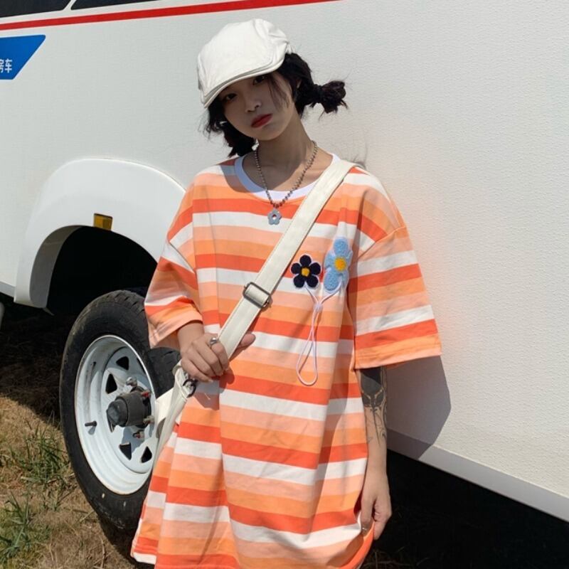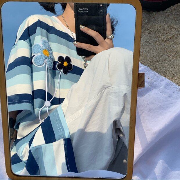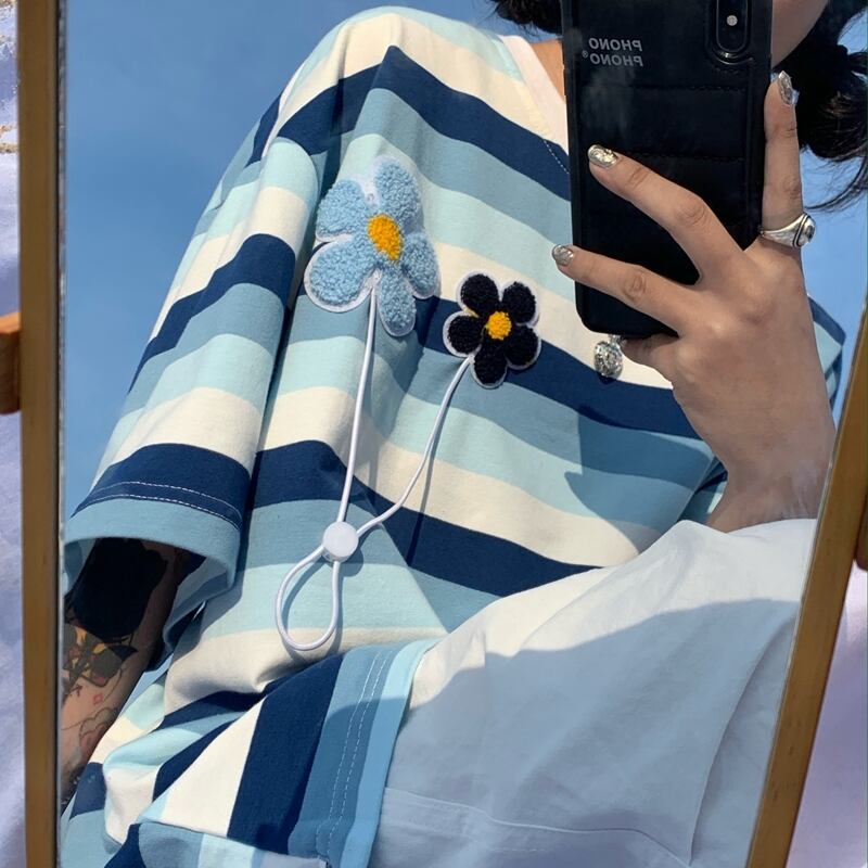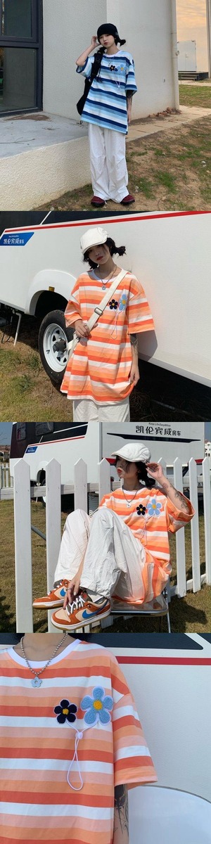 サマースタイルFlowerデザイン ストライプTシャツ ルーズトップス かわいい 夏物 フラワーデザイン Brother_is_Style56292960842