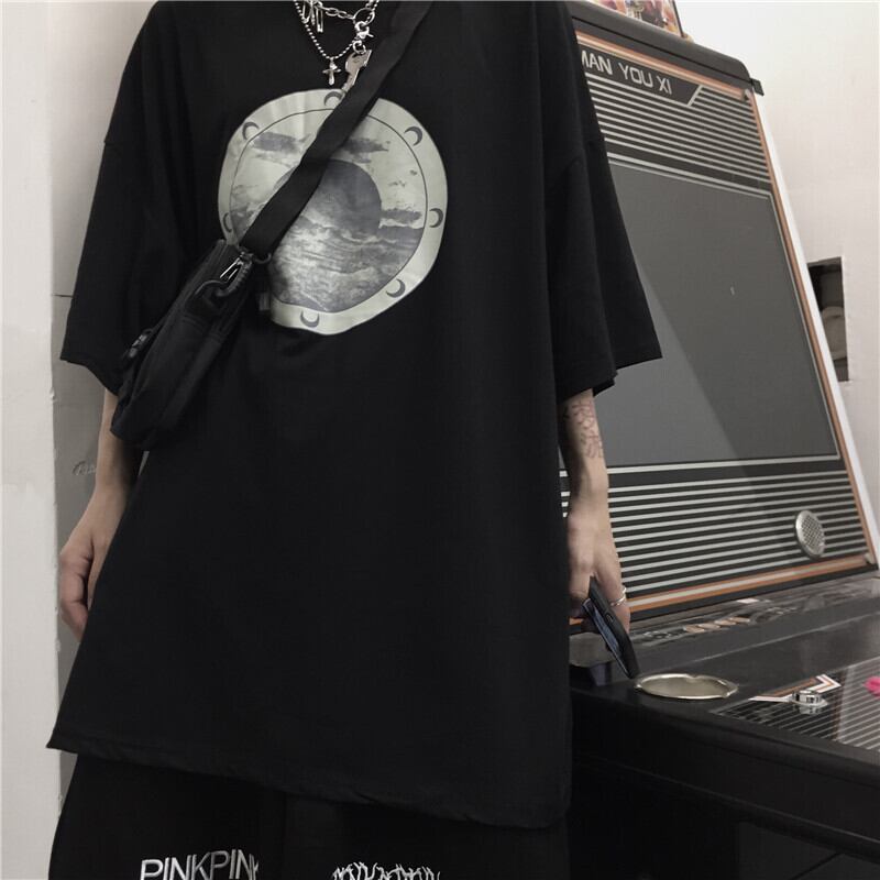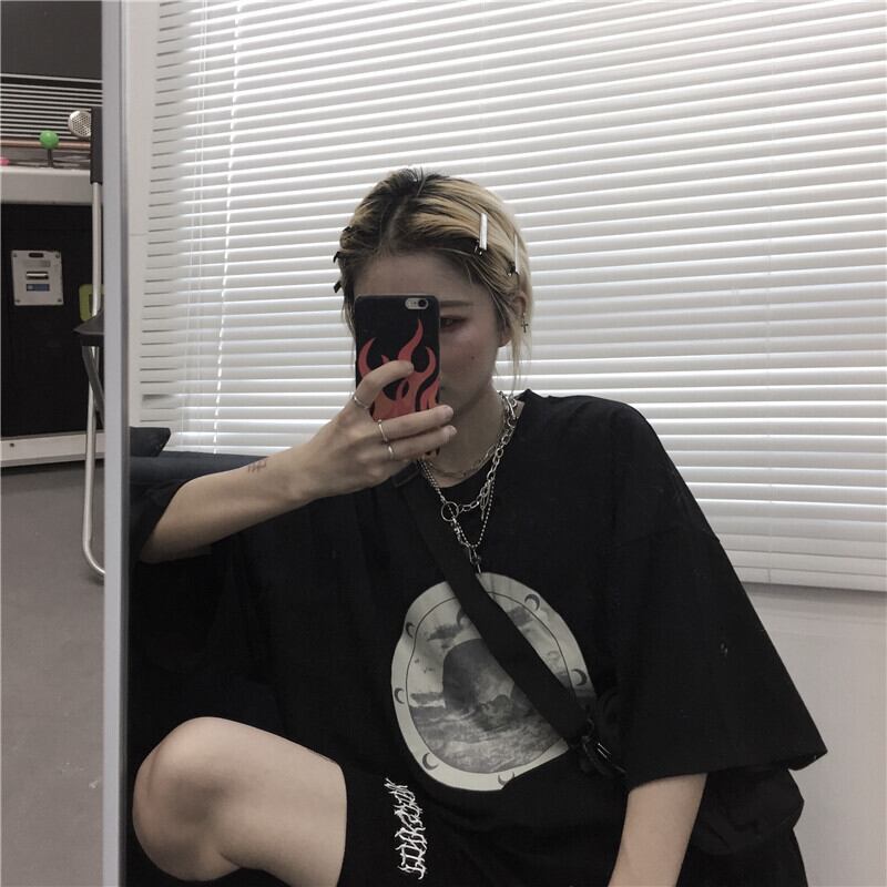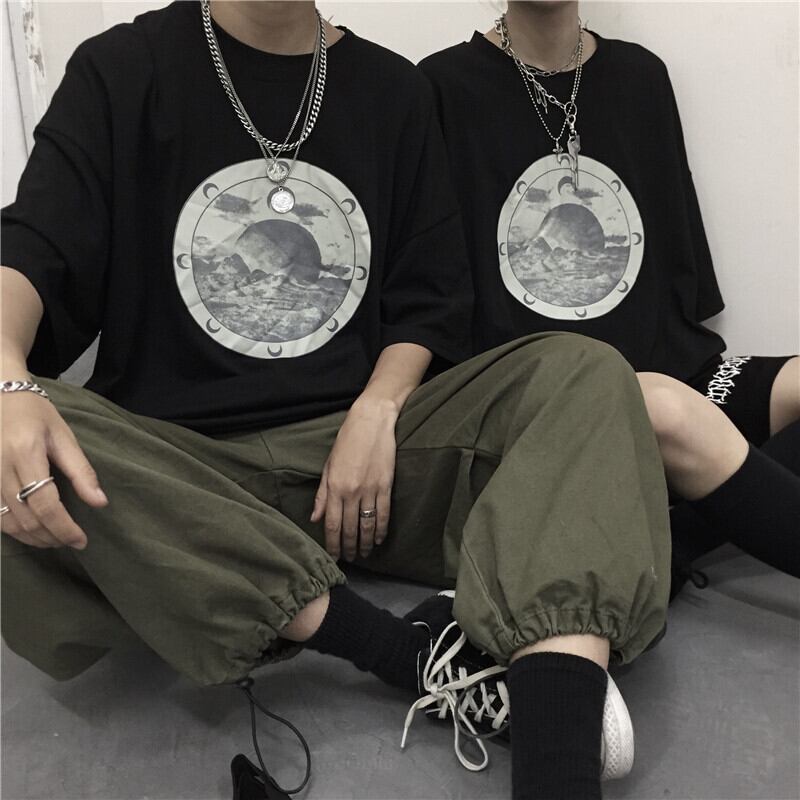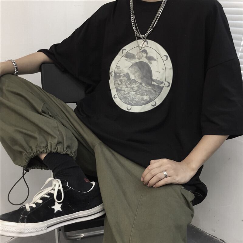 Tシャツ サマースタンダードプリント柄ブラックルーズラウンドネックトップス レトロ 夏物 Oネック Brother_is_Style46683971362