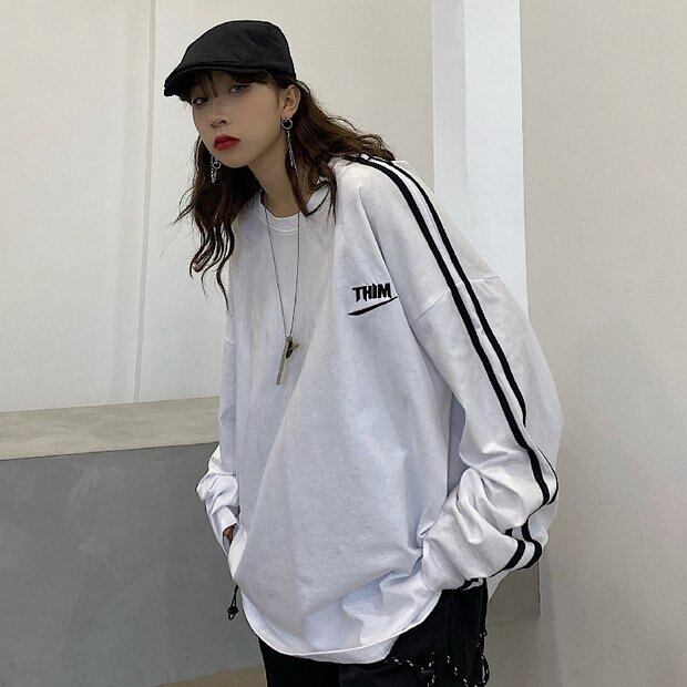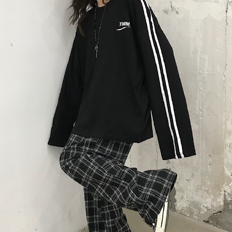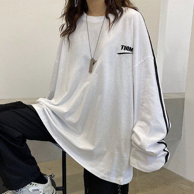 スプリングスタンダードTシャツ ルーズブラックストライプブラウス ロング レトロ 春物 Brother_is_Style47537902841