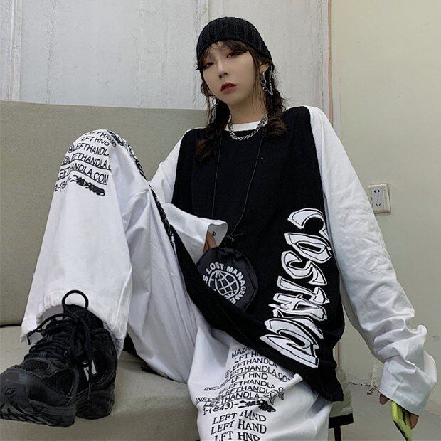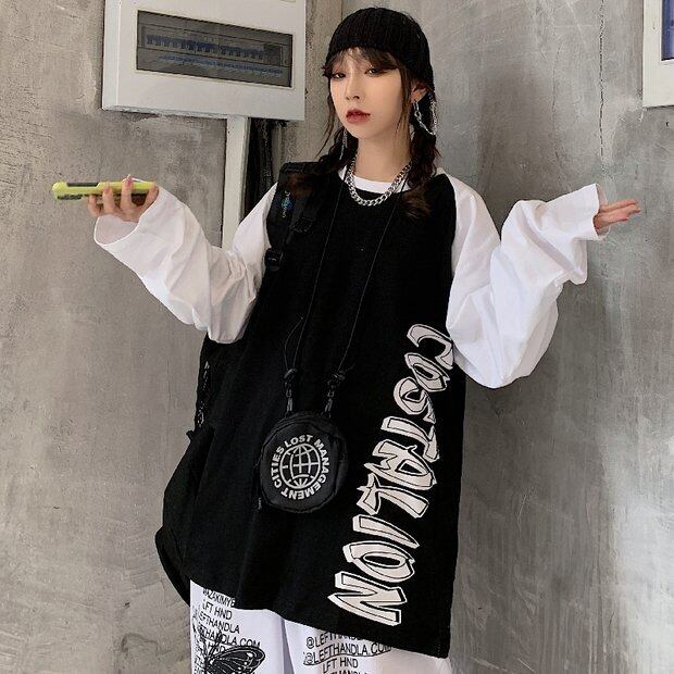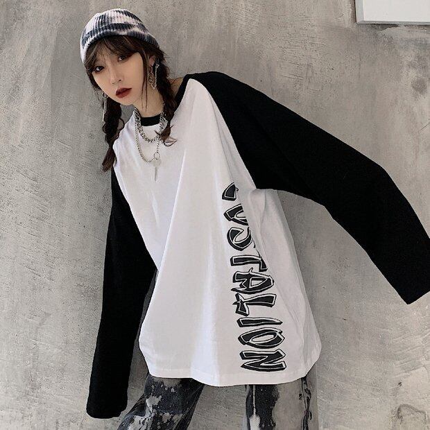 スプリングスタイルブラックトップス ルーズTシャツ ロング かわいい 春物 ステッチ Brother_is_Style8335292903