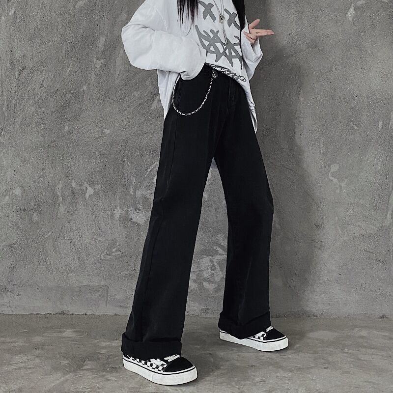 スプリングオータムルーズハイウェストウェストパンツ ブラックジーンズ ストリート 春物 秋物 Brother_is_Style15042448208