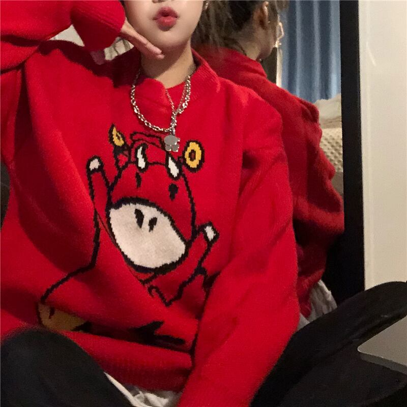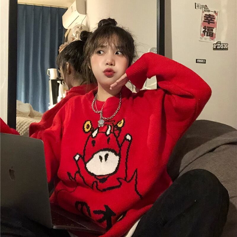 プルオーバー セーター レディーススプリングオータムレッドルーズラウンドネックコート 春物 秋物 Oネック Brother_is_Style72980258370