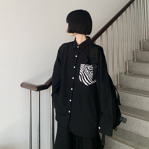 シャツ スプリングブラックトップス ルーズジャケット ロング かわいい 春物 ステッチ Brother_is_Style1642978318