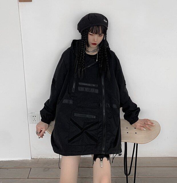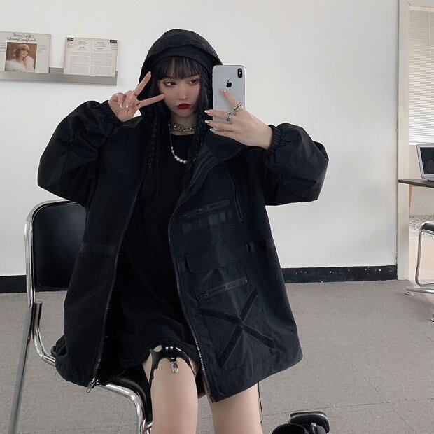 オータムウィンターダークフードトップス ルーズブラックカジュアルジャケット 秋物 冬物 Brother_is_Style72390850029