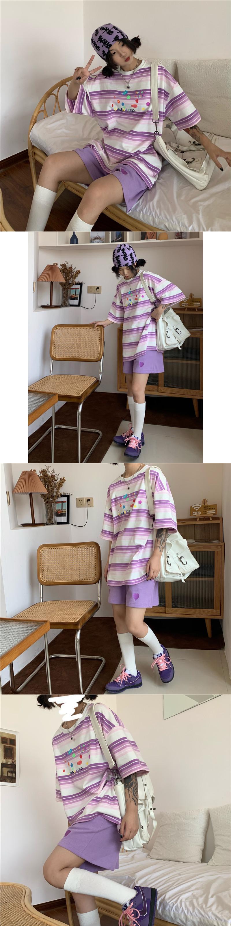 色:ピンクのTシャツ,パープルTシャツ,青いTシャツ,グレーのショートパンツ,パープルショーツ,ブルーショートパンツ,黒のショートパンツ