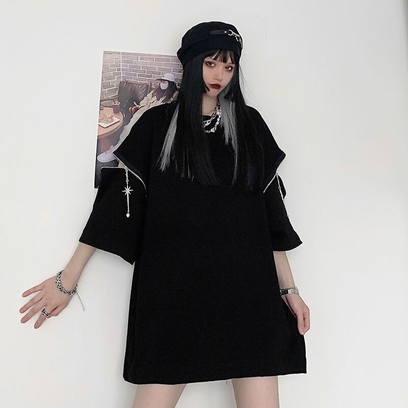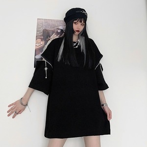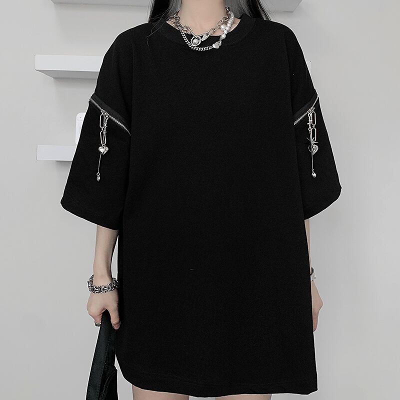 サマージッパーブラックトップス ルーズTシャツ 夏物 Brother_is_Style25795367449