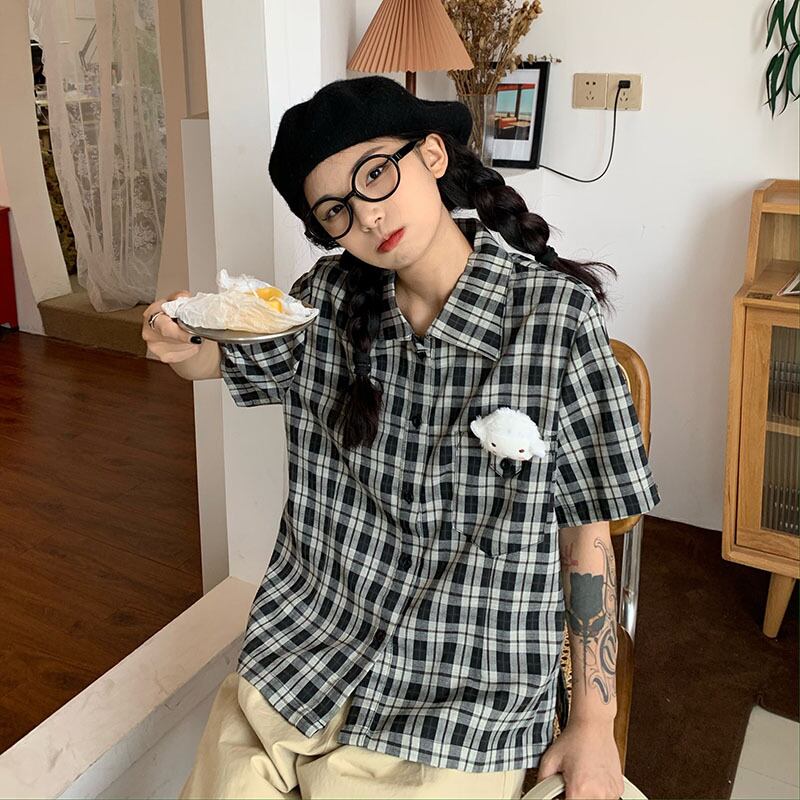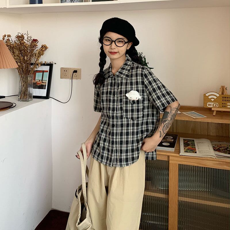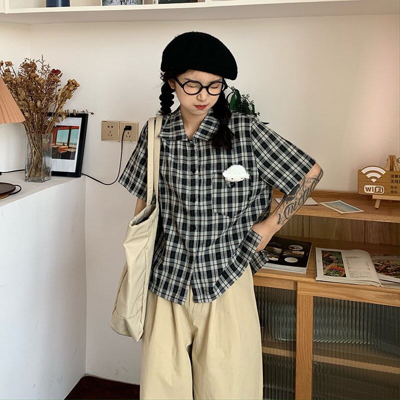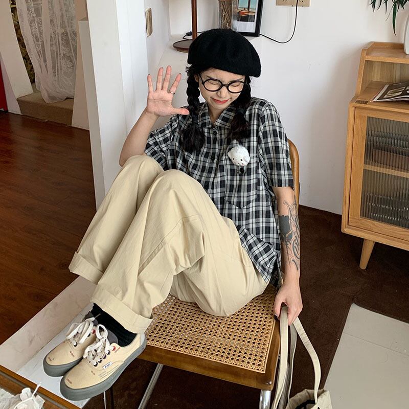 色:チェック柄半袖シャツ,ライトカーキカーゴパンツ