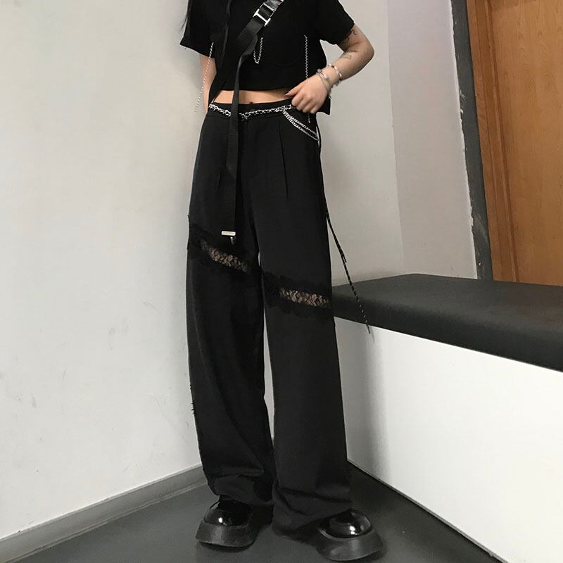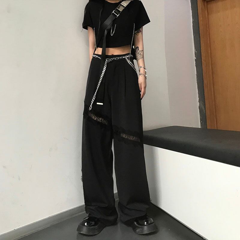 ブラックパンツ サマースタンダードレースルーズ薄手カジュアル レトロ 夏物 ステッチ Brother_is_Style96402989341