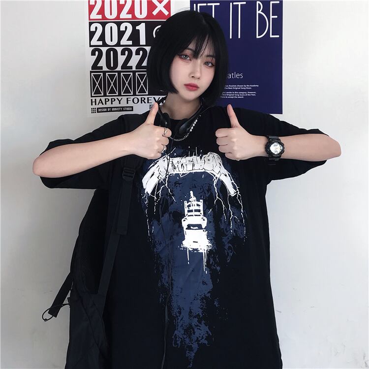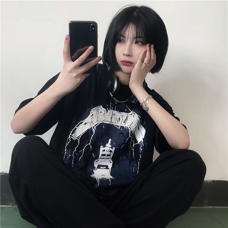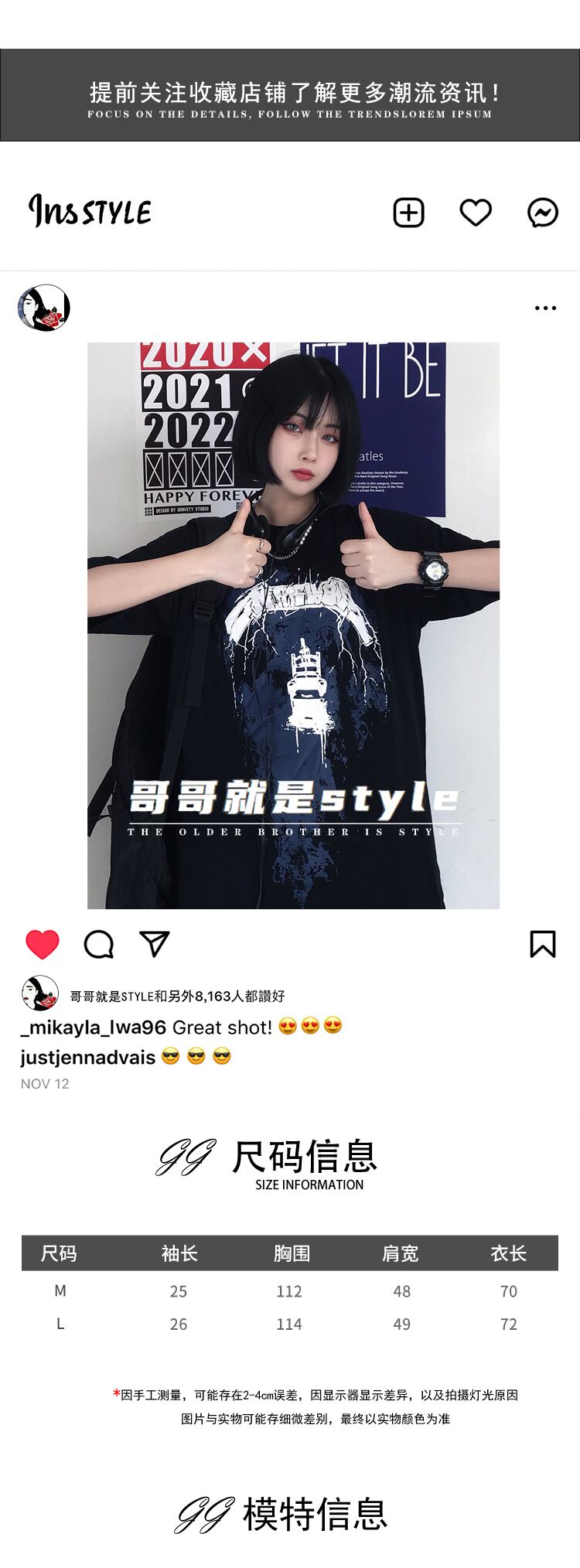 サマースタイルダークプリントトップス ルーズブラックTシャツ ストリート かわいい 夏物 Brother_is_Style42707425189