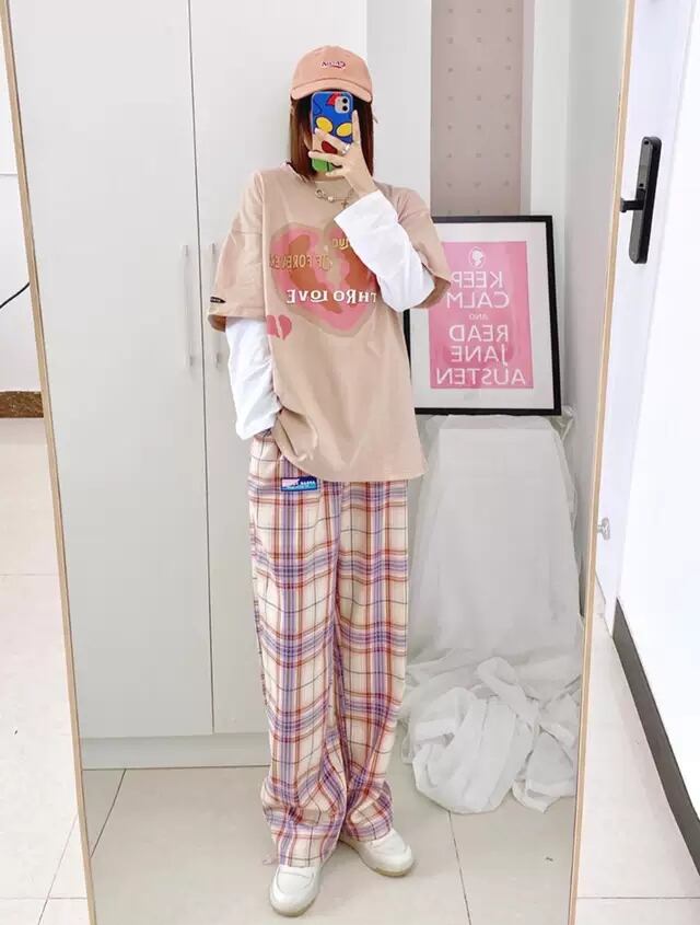 パンツ サマー薄手格子柄ルーズハイウェストウェストワイドレッグカジュアル ピンク 夏物 ワイドパンツ Brother_is_Style23110216567