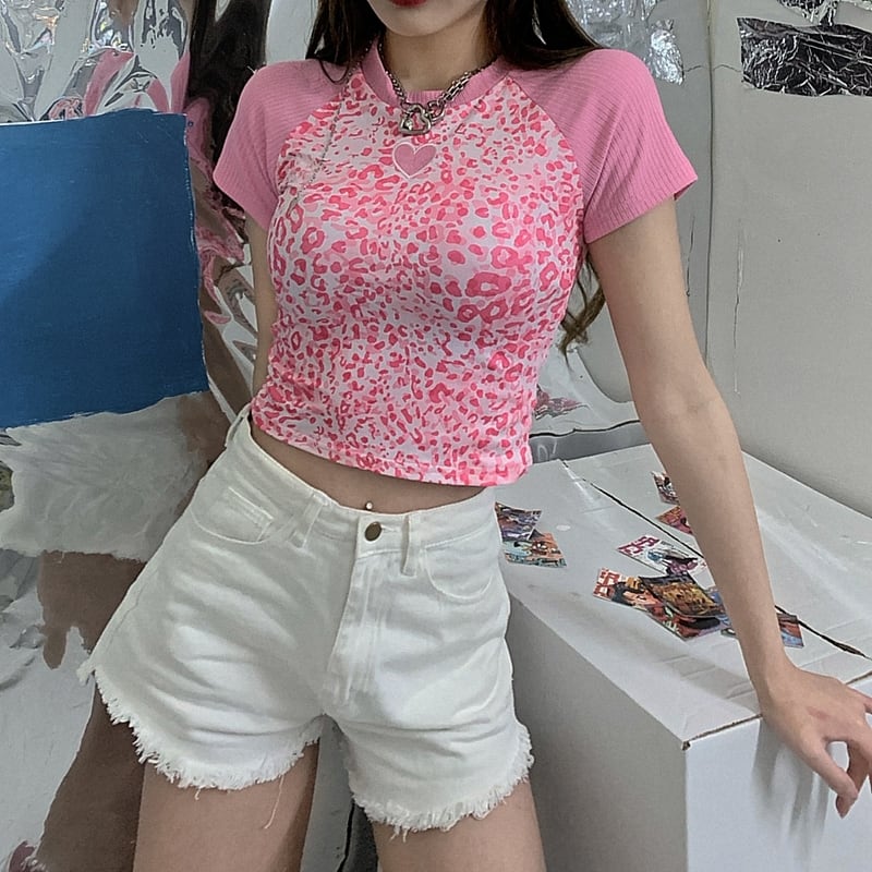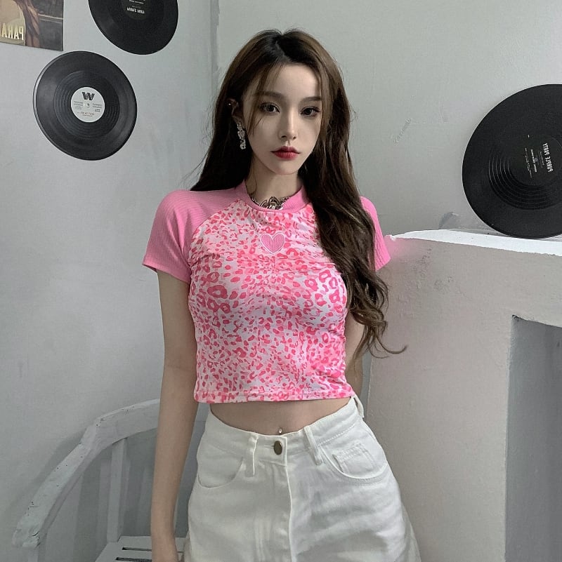 サマーレオパードプリント柄Tシャツ スリムクロップトップ トップス ピンク 大人ガーリー スウィート キュート カジュアル 夏物 Brother_is_Style20540547090