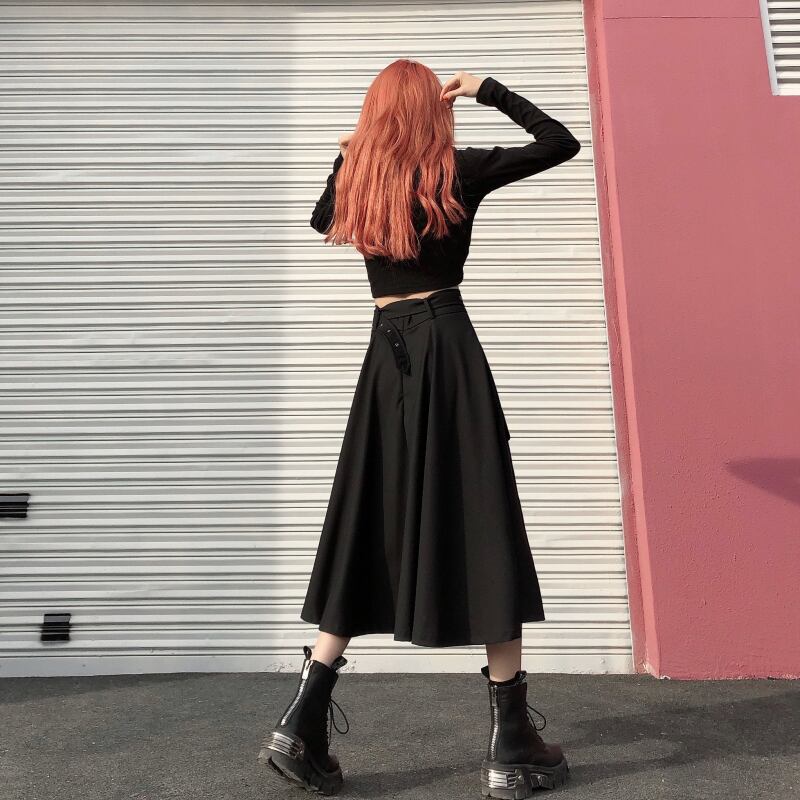スカート サマースタンダードブラックハイウェストウェスト薄手Aライン レトロ ストリート 夏物 Brother_is_Style73891803942