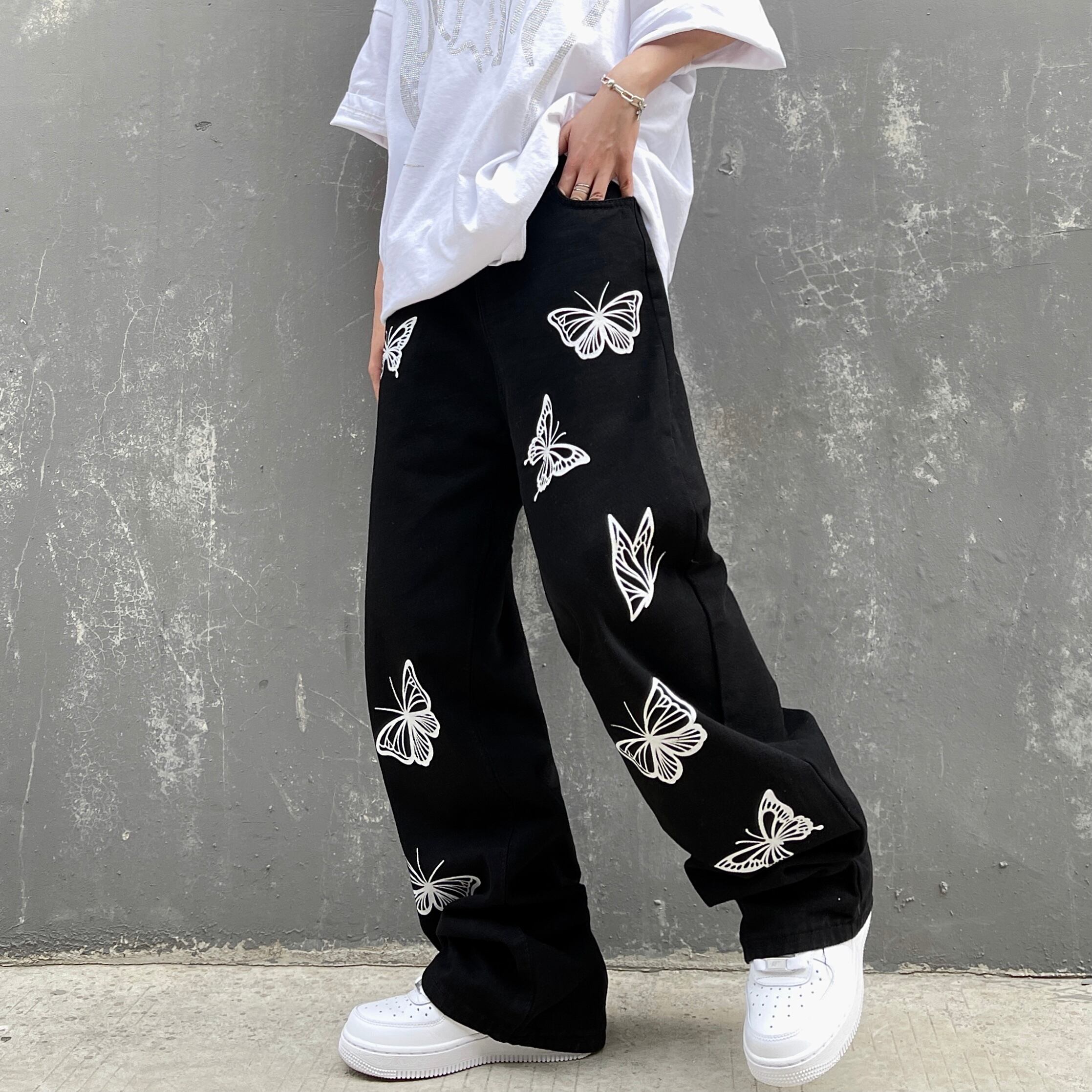 ジーンズ サマースタンダードButterflyデザイン プリントワイドレッグパンツ ブラックルーズ薄手 レトロ ストリート 夏物 ワイドパンツ Brother_is_Style84607751154