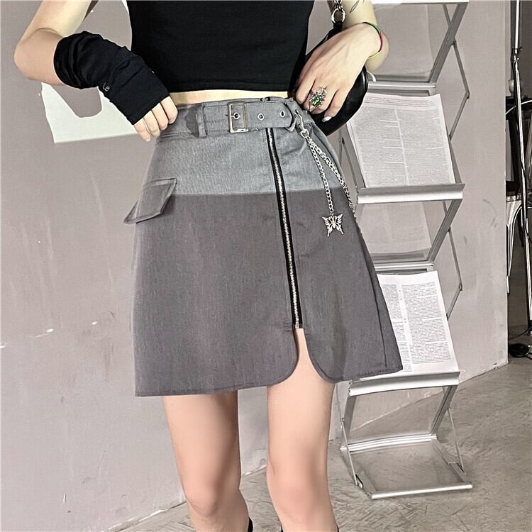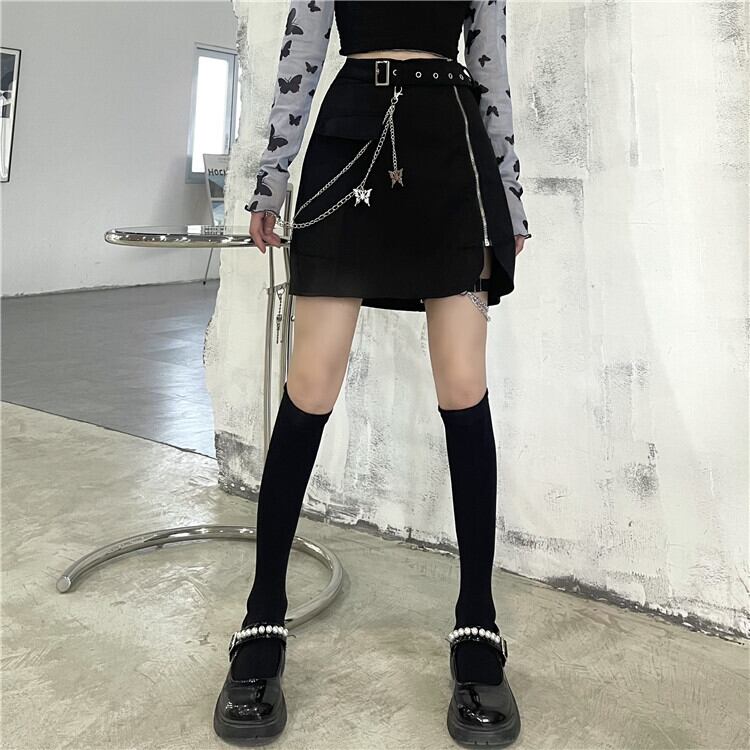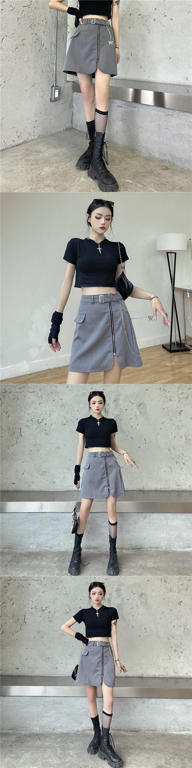 スカート サマーダークブラックジッパーハイウェストウェストスタンダードAラインショート レトロ 夏物 Brother_is_Style8592006448