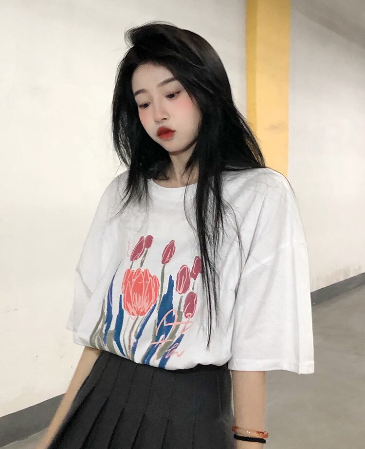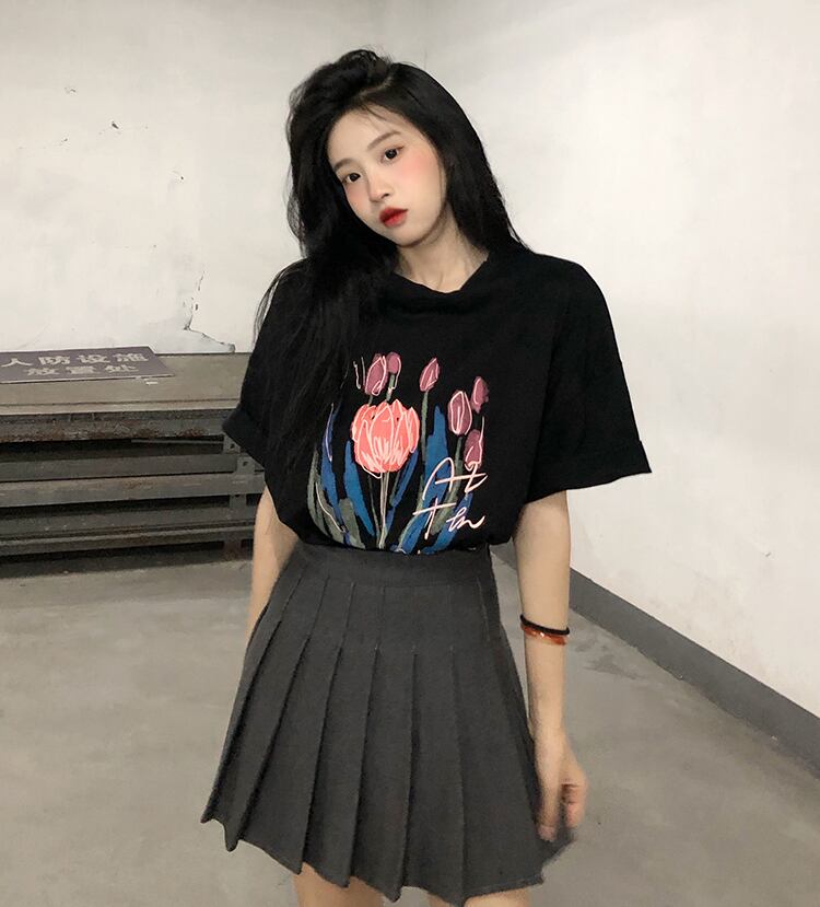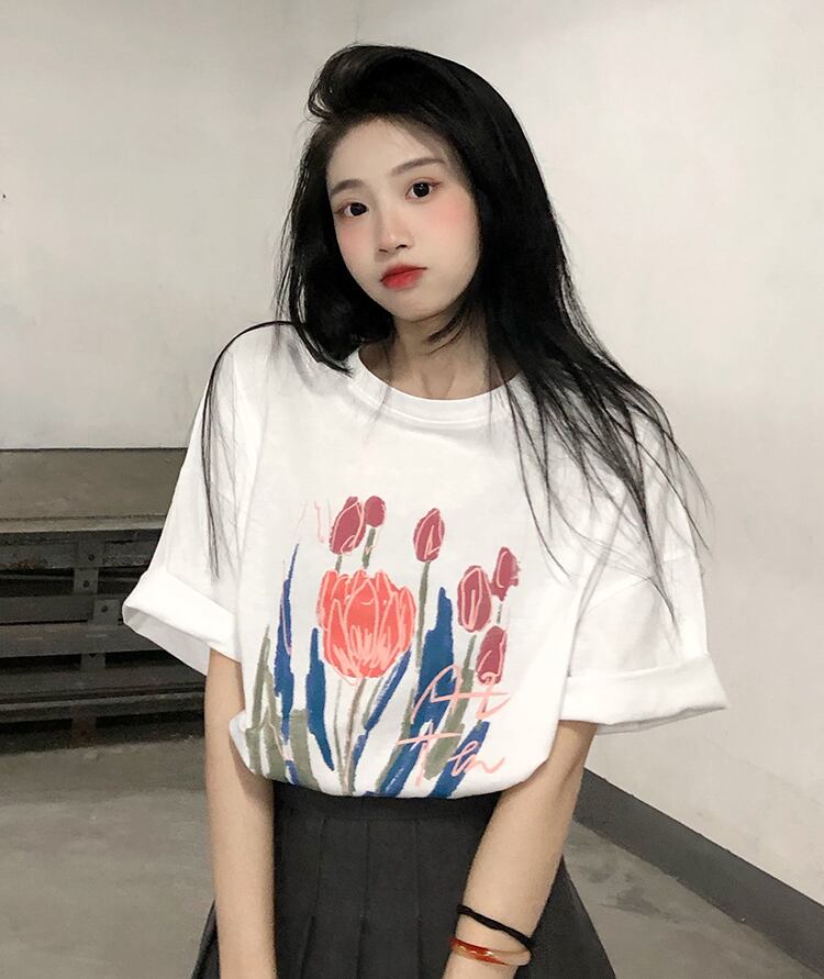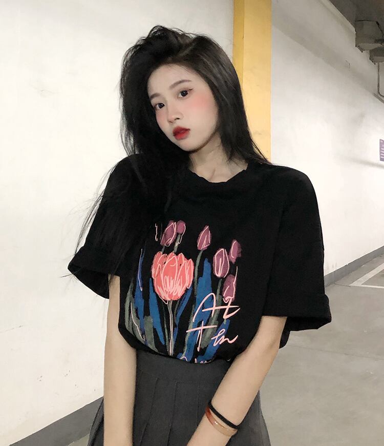 色:白い花柄Tシャツ,ブラックフローラルTシャツ
