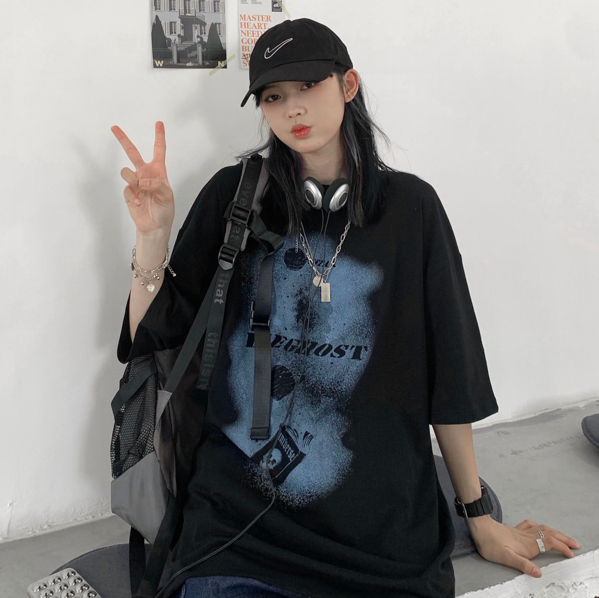 レディースサマーダークプリントブラックルーズTシャツ トップス ストリート 夏物 Brother_is_Style59859334726