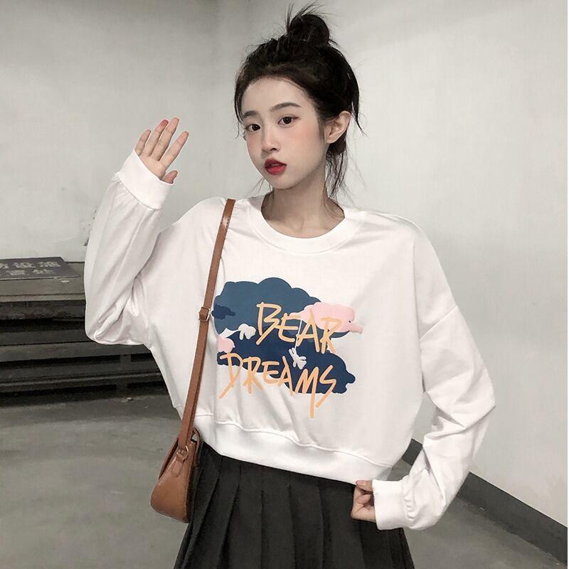 プリント柄ショートプルオーバー セーター ルーズホワイトトップス レディース ロング Brother_is_Style71507069042