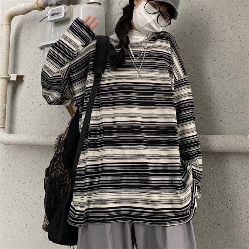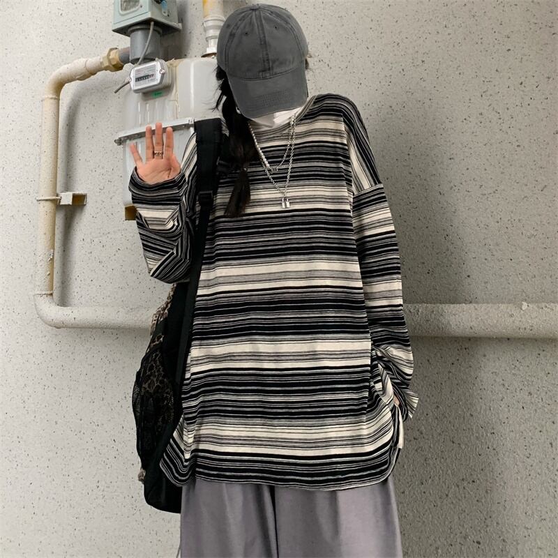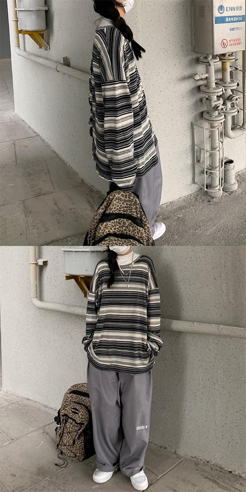 サマースタンダードストライプシャツ トップス ルーズラウンドネックTシャツ ロング レトロ 夏物 Oネック Brother_is_Style14863388579